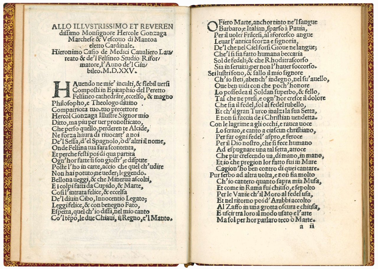 Rare first edition. The date of printing can be presumed from the dedication to Cardinal Ercole Gonzaga (dated 1525) and from the historical facts referred in the text. The present is the issue without the colophon; some identical copies, with the same fingerprint, bear the printing place and the name of the printer at the foot of the final woodcut (“Stãpata in Bologna per Cinthio Achillino”).