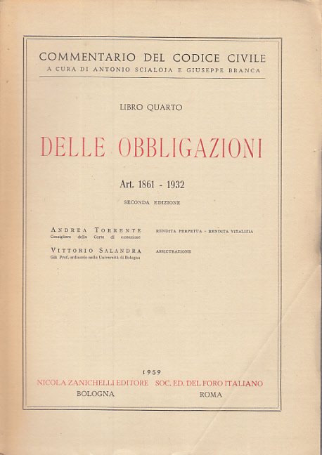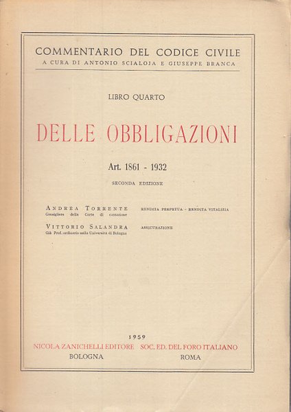 In-8 (Cm 25 x 18), pp. XXVI-453, br. ed. con sovracop. Collana "Commentario del codice civile a cura di A. Scialoja e G. Branca - Libro Quarto - Delle Obbligazioni art 1861-1932". Seconda edizione. Intonso. Piccola pieghetta e lieve ingiallitura alla brossura anteriore. OTTIMO