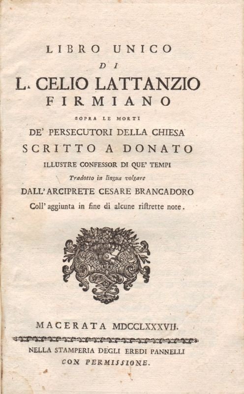 Libro unico di L. Celio Lattanzio Firmiano Sopra le morti de' persecutori della Chiesa, scritto a Donato illustre confessor di que' tempi, tradotto in lingua volgare dall'arciprete Cesare Brancadoro. Coll'aggiunta in fine di alcune ristrette note .