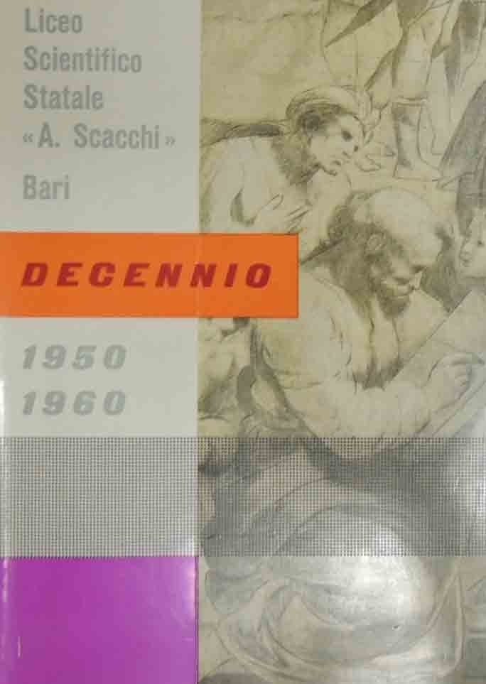 Liceo Scientifico Statale Arcangelo Scacchi – Bari, Decennio 1950-51 1959-60, Scuola Tipografica Istituto Prov. Apicella per sordomuti, Molfetta 1961, pp. 290, ill. b.n. e col., 1 c. di tavv. f.t., cm 24, br. ed. Indice: Presentazione – Note storiche – La famiglia scolastica – Uno sguardo all’Istituto – Riflessioni – Con i giovani e per i giovani – Ponti verso la vita – Il decennale della Costituzione – Proposte e discussioni – Tavole fuori testo. Autori: N. Dell’Andro, G. Faretra, O. Longo, N. Maurantonio, L. Puccio, C. Rodi. Tavole fuori testo: G. Corazziari, E. Nuzzo, R. Giacovazzo. Tracce d’uso alla brossura, per il resto ben conservato. Raro.