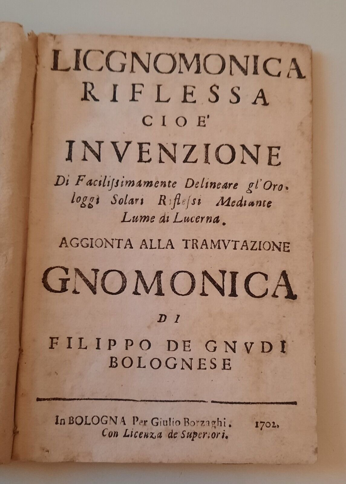 LICGNOMONICA RIFLESSA CIOE' INVENZIONE DI FACILISSIMAMENTE DELINEARE GL'OROLOGGI SOLARI... AGGIONTA ALLA TRAMUTAZIONE GNOMONICA DI FILIPPO DE GNUDI BOLOGNESE IN BOLOGNA PER GIULIO BORZAGHI 1702In 12, pag. 34 [1], senza copertina.Macchie alla prima pagina bianca, rilegatura e rifilatura a tratti non precisa ma senza perdita di testo.Ulteriori dettagli e immagini a richiesta.