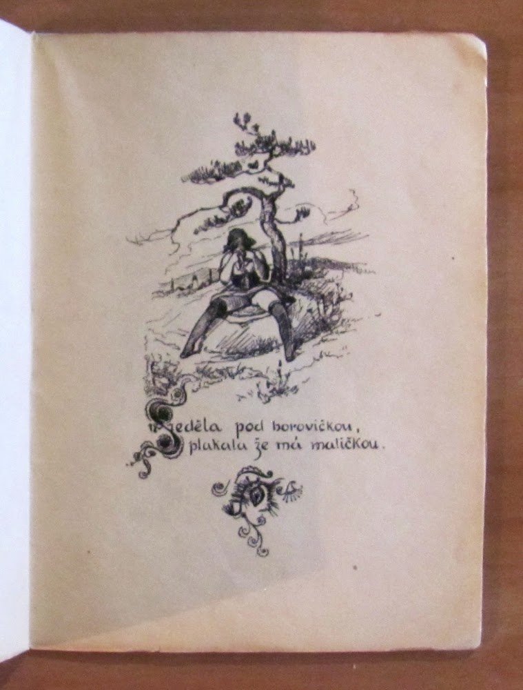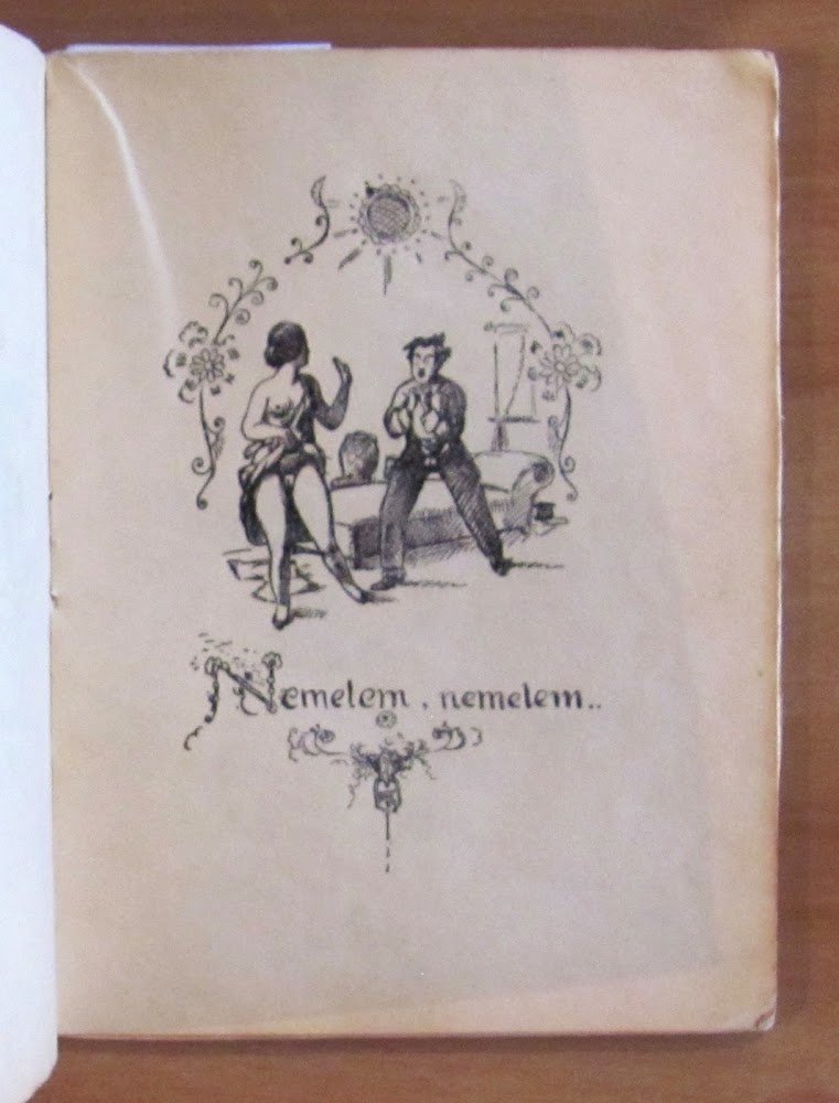 20 tavole in b/n f.t., anonime, basate su motivi di canzoni popolari. Edizione Anonima s.d. 1927 ca. Tiratura Limitata a 200 Esemplari. Brossura editoriale con mancanza dell'angolo basso esterno della retrocopertina e piccola imperfezione al margine esterno della copertina anteriore. 12x16; pp.20 di sole illustrazioni. Raro e in Ottimo stato. , Molto buono (Very Good)