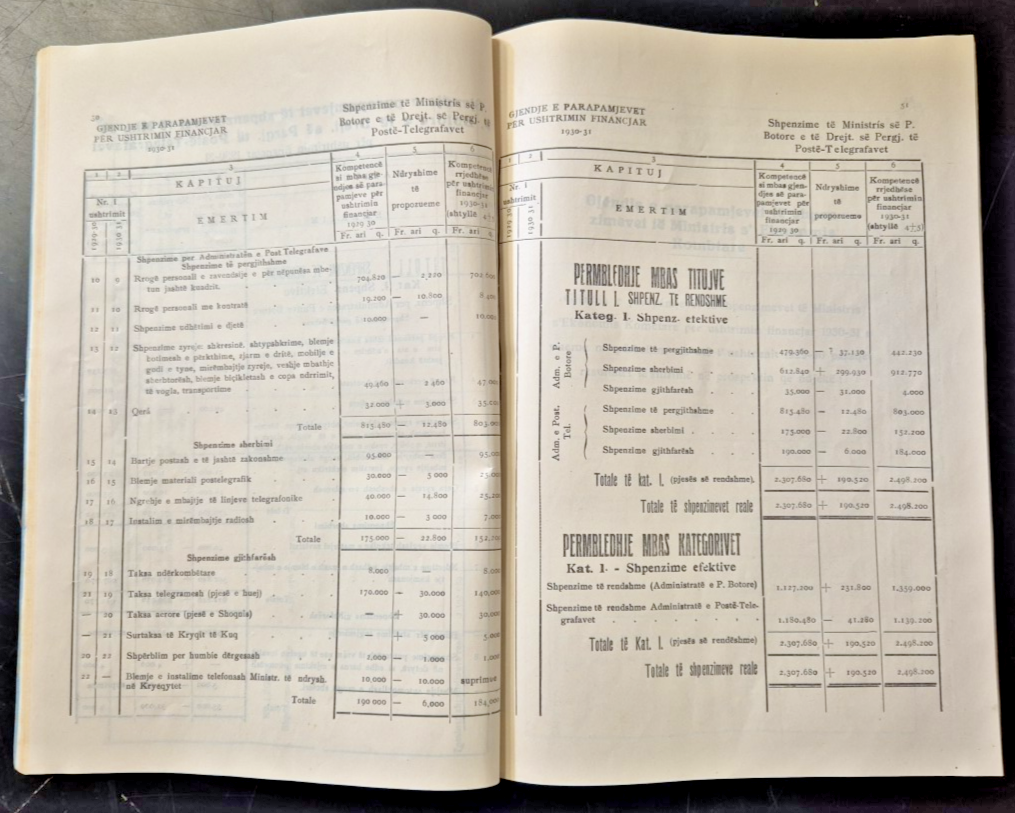 Mbretnija Shquiptare Ministrija e Financavetk 1930. 77 pagine. Copertina editoriale in brossura. Stato di conservazione: molto buono (pagine normalmente ingiallite) Libro usato saggistica