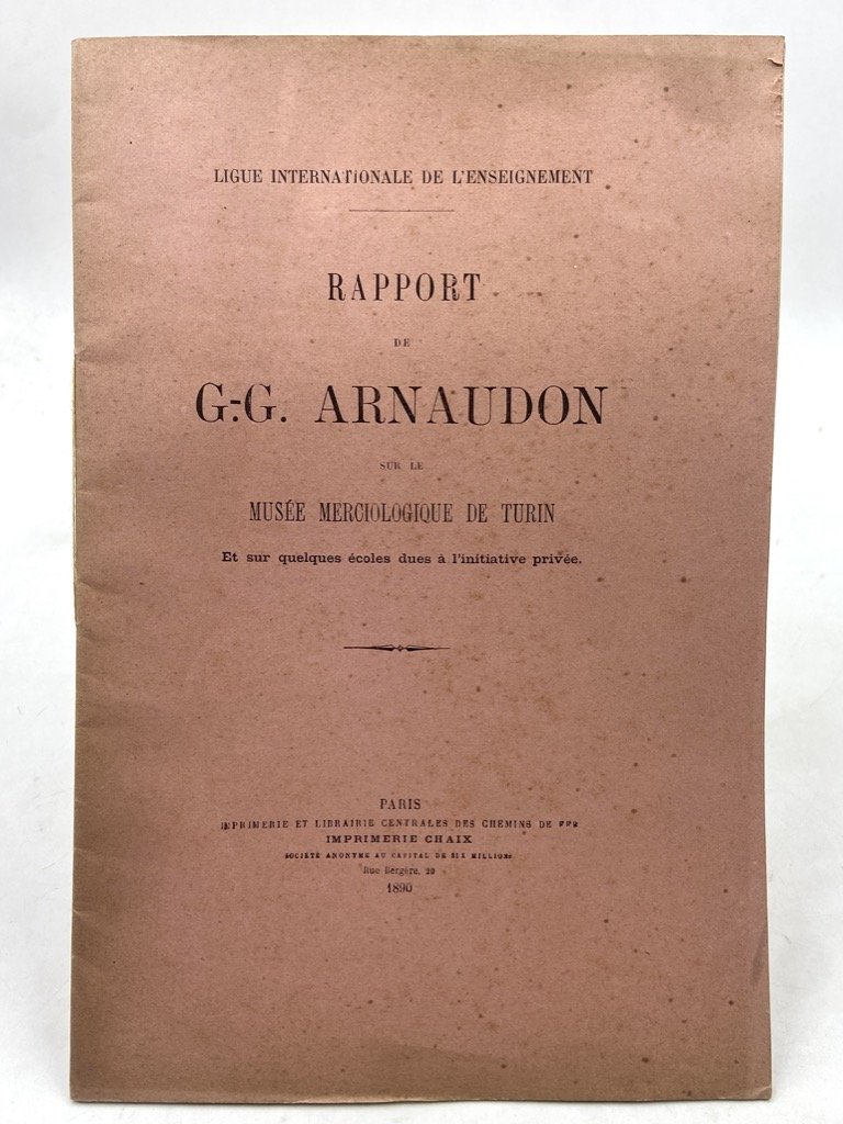 Estratto in brossura editoriale a stampa, cm 24x16, pp 32. Estratto dal Bulletin du Congrès de la Ligue Internationale de l’Enseignement par initiative privée, 1889. Chimico formatosi a Parigi presso la Manufacture des Gobelins e collaboratore di Ascanio Sobrero all’Arsenale torinese, Gian Giacomo Arnaudon fu scienziato poliedrico e dai molteplici interessi; nel 1851 guidò la delegazione piemontese all’Esposizione di Londra, e si convinse della necessità di svecchiare tanto il sistema formativo quanto quello economico sabaudo: diede vita all’insegnamento di merceologia presso il Reale Istituto Tecnico nel 1860, e nello stesso anno fondò il primo museo merceologico italiano, inizialmente ospitato presso il Collegio Monviso e poi trasferito nell’ex mercato comunale di Corso Palestro (1885). Il Museo, rivolto soprattutto alla formazione di una classe di tecnici per la nascente vocazione industriale cittadina, ospitava una collezione di campioni raccolta inizialmente a Parigi (in seno alla Société chimique di cui Arnaudon fu presidente) e premiata all’Esposizione Italiana (Firenze 1861)