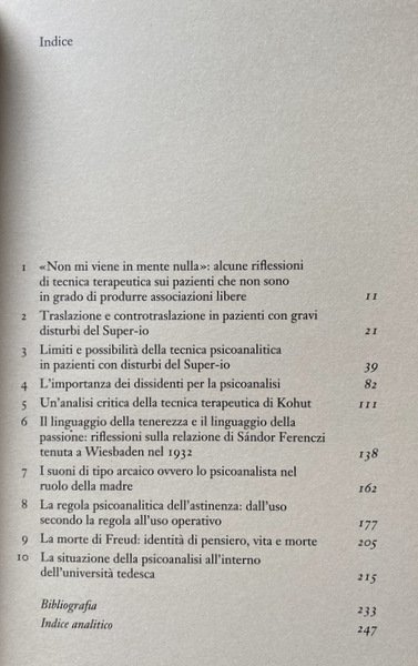 Questo testo di tecnica psicoanalitica continua il discorso iniziato dall'autore con "Il mestiere dell'analista" riproponendo alcuni temi fondamentali nella sua riflessione: la patologia del Super-io e la sua influenza sul transfert e il controtransfert; la regola dell'astinenza; il problema del paziente che non riesce a produrre associazioni libere («non mi viene in mente nulla»). Inoltre, argomenti legati alla storia della psicoanalisi: la logica e le conseguenze dei numerosi scismi che la caratterizzano; una critica delle istituzioni psicoanalitiche; un'analisi della tecnica terapeutica di un notissimo analista americano, Heinz Kohut; Freud nel suo rapporto con la malattia e la morte. Un altro tema caro a Cremerius è quello dell'orientamento teorico e clinico che deriva da Sàndor Ferenczi, con la contrapposizione di un atteggiamento amorevole, «materno», dell'analista a uno più distaccato e oggettivante, quello raccomandato da Freud. Cremerius respinge questa dicotomia, e invita a considerare la complessità e la problematicità del rapporto terapeutico al di fuori da ogni posizione estrema e dogmatica.