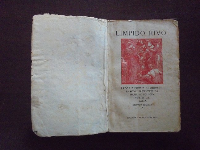 In 16∞: pp. VII + 246. Con illustrazioni f.t. Prose e poesie di Giovanni Pascoli presentate da Maria ai figli Giovinetti d`Italia.Copertina firmata da Adolfo De Carolis. Br. guasta. Bruniture.