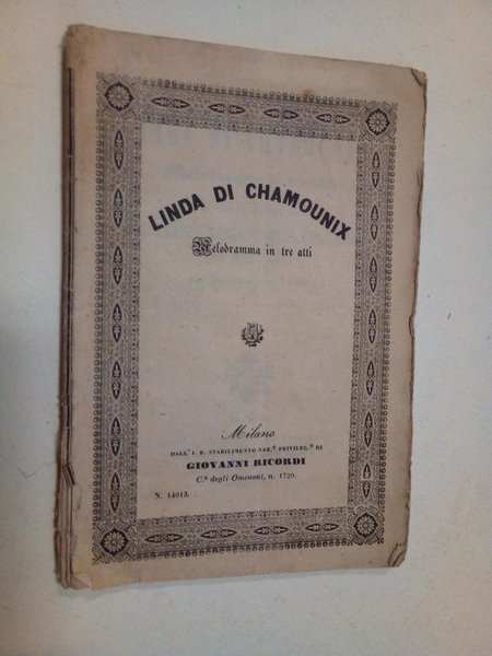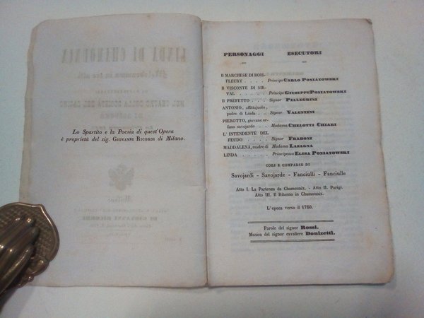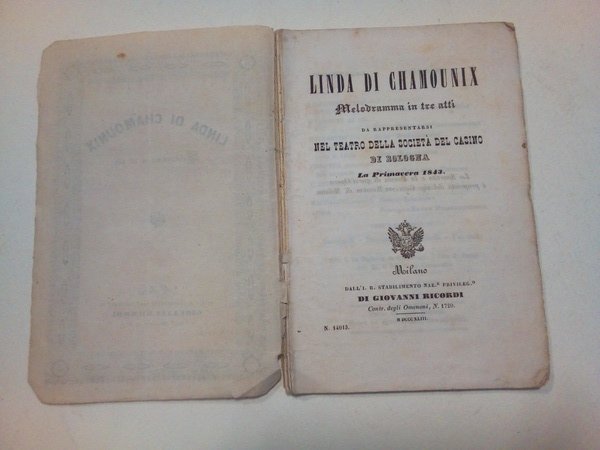 Linda di Chamounix. Melodramma in tre atti da rappresentarsi nel Teatro della Società del Casino di Bologna la primavera 1843.