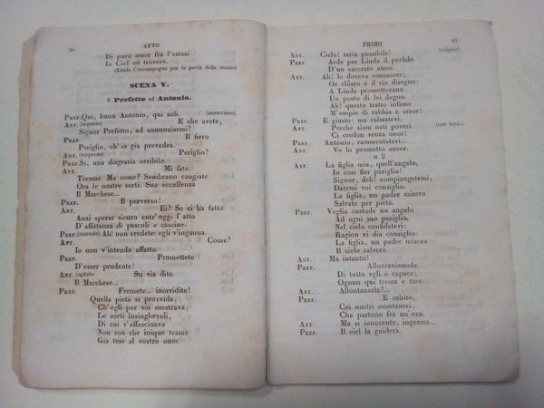 Cm. 17,5 x 12; pp. 48; brossura editoriale con piccoli fregi tipografici al piatto e al dorso; cucito.<BR>CONDIZIONI BUONE: piccole mancanze al dorso; una piccola perdita all'angolo inferiore di p. 21 senza danno al testo; alcune lievissime fioriture.<BR>La particolarità di questi libretto, che riporta a stampa i nomi delgi interpreti, è l'indicazione della partecipazione in veste di cantanti dei due principi Poniatowski, GIuseppe e Carlo, e della moglie di quest'ultimo Elisa.