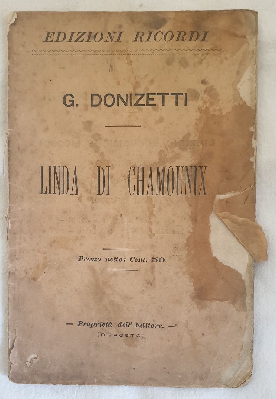 Bel libretto d'opera del febbraio 1882 dell'opera "Linda di Chamounix" di Gaetano Donizetti (1797-1848) su libretto di Gaetano Rossi. La prima rappresentazione ebbe luogo il 19 maggio 1842 a Vienna.<BR>In discrete condizioni. Brossura editoriale in mediocri condizioni generali con usure e mancanze ai margini e dorso. Macchie. Restauro al piatto anteriore. Legatura in discrete condizioni con rotture. All'interno le pagine si presentano in buone condizioni con fioriture. In 16. Dim. 20x13 cm. Pp. 43.