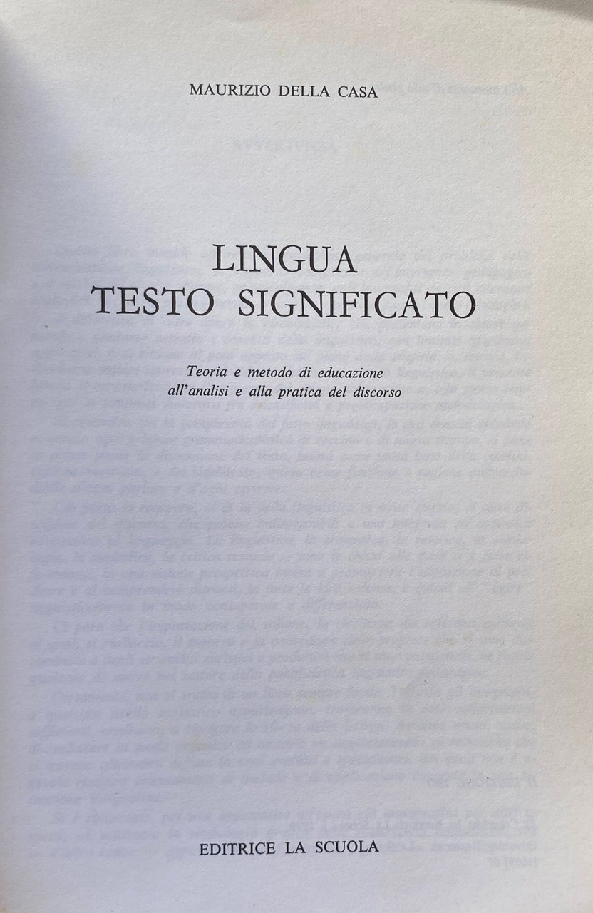 Soggetti: Linguistica, Scienze delle comunicazioni, Comunicazione, Didattica, Metodo, Insegnamento, Lingua, Italianistica, Testo, Significato, Semiotica, Segni, Segno, Senso, Analisi, Grammatica, Struttura, Discorso, Retorica, Dialettica, Insegnanti, Pedagogia, Semiologia, Libri di testo, Educazione, Riferimento, Bibliografia, Studi culturali, Manuali, Tecnica, Libri rari Vintage fuori catalogo, Edward Sapir, Jacques Lacan, Ernst Cassirer, Noam Chomsky, Scrittura, Linguaggio, Filosofia, Organicismo, Strutturalismo, Scuole di pensiero, Critica, Interpretazione, Geografia, Logica, Testo narrativo poetico, Romanzo, Modelli, Approccio, Poesia, Comicità, Teorie linguistiche, Curricolo, Funzioni, Strumenti, Concetti, Confronti, Contenuti, Cinema, Codice, Termini, Musica, Regole, André Martinet, Leont'ev, Jean Piaget, Paul Fraisse, Psicanalisi, Psicologia, Tecnologia, Racconto, Società, Formalismo americano russo, Sociologia, Pagliano Ungari, Todorov, Stilistica, Critica letteraria, Erich Auerbach, Filologia, Bachelard, Aristotele, Stilistica, Barilli, Roland Barthes, Bernstein, Maurice Blanchot, J. Cohen, C. Brémond, Bruner, Mito, Istruzione, Sintassi, Eugen Coseriu, Luciano Anceschi, Giornalismo, Editoria, Stampa, Articoli, Reportage, Jacques Derrida, De Saussure, Tullio De Mauro, Umberto Eco, G. Durand, Codici, Ideologia, G. Genette, N. Frye, Arte, Letteratura, Freud, Gombrich, Freinet, Johann Thomas Freige, Michel Foucault, Mircea Eliade, Guiraud, Greimas, Louis Trolle Hjelmslev, Alain Robbe-Grillet, Metonimia, Metafora, Jacobi, Jakobson, Katz, Jung, Kristeva, McLuhan, Mounin, Lyons, Lotman, Labov, Valutazione, Estetica, Pirandello, Umorismo, Propp, Favola, Mitologia, Personaggi, Segre, Rosiello, Ricoeur, Marxismo, Dialetti, Simbolismo, Alienazione, Scurati, Sartre, Metalinguaggio, Comportamento, Skinner, Ullmann, Vygotskij, Verlaine, Dante Alighieri, Forma, Verbi, Narratologia, Morfologia, Sintagma, Costruzione, Interpunzione, Prosodia, Trasformazioni, Matrici, Commento, Produzione, Descrizione, Giornale, Temi, Riassunto, Sintesi, Similitudine, Suffissi, Sinonimi, Contrari, Allegoria, Fantastico, Fantasy, Categorie logiche, Argomenti, Predicati, Mass Media, Lingua scritta parlata, Competenze, Schede, Griglie, Parametri, Giudizio, Unità, Creatività, Linguistics, Communication sciences, Communication, Didactics, Method, Teaching, Language, Italian, Text, Meaning, Semiotics, Signs, Sign, Sense, Analysis, Grammar, Structure, Discourse, Rhetoric, Dialectic, Teachers, Pedagogy, Semiology, Books of text, Education, Reference, Bibliography, Cultural studies, Manuals, Technique, Rare books out of print, Writing, Language, Philosophy, Organicism, Structuralism, Schools of thought, Criticism, Interpretation, Geography, Logic, Poetic narrative text, Novel, Models, Approach, Poetry, Comedy, Linguistic Theories, Curriculum, Functions, Tools, Concepts, Comparisons, Contents, Code, Terms, Music, Rules, Psychoanalysis, Psychology, Technology, Storytelling, Society, American Russian Formalism, Sociology, Stylistics, Criticism Literary, Philology, Aristotle, Stylistics, Myth, Education, Syntax, Journalism, Publishing, Press, Articles, Codes, Ideology, Literature, Metonymy, Metaphor, Evaluation, Aesthetics, Humor, Fable, Mythology, Characters, Marxism, Dialects, Symbolism, Alienation, Metalanguage, Behavior, Form, Verbs, Narratology, Morphology, Syntagm, Construction, Punctuation, Prosody, Transformations, Matrices, Comment, Production, Description, Newspaper, Themes, Summary, Synthesis, Simile, Suffixes, Synonyms, Antonyms, Allegory, Fantastic, Logical categories, Topics, Predicates, Spoken written language, Skills, Cards, Grids, Parameters, Judgement, Units, Creativity