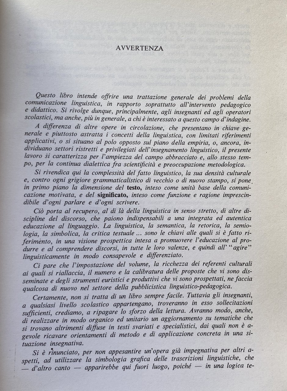 Ci pare che l'impostazione del volume, la ricchezza dei referenti culturali ai quali si riallaccia, il numero e la calibratura delle proposte che vi sono disseminate e degli strumenti euristici e produttivi che vi sono prospettati, ne faccia qualcosa di nuovo nel settore della pubblicistica linguistico-pedagogica. Certamente, non si tratta di un libro sempre facile. Tuttavia gli insegnanti, a qualsiasi livello scolastico appartengano, troveranno in esso sollecitazioni sufficienti, crediamo, a ripagare lo sforzo della lettura. Avranno modo, anche, di realizzare in modo organico ed unitario un aggiornamento su tematiche che si trovano altrimenti diffuse in testi svariati e specialistici, dai quali non è agevole ricavare orientamenti di metodo e di applicazione concreta in una situazione insegnativa.