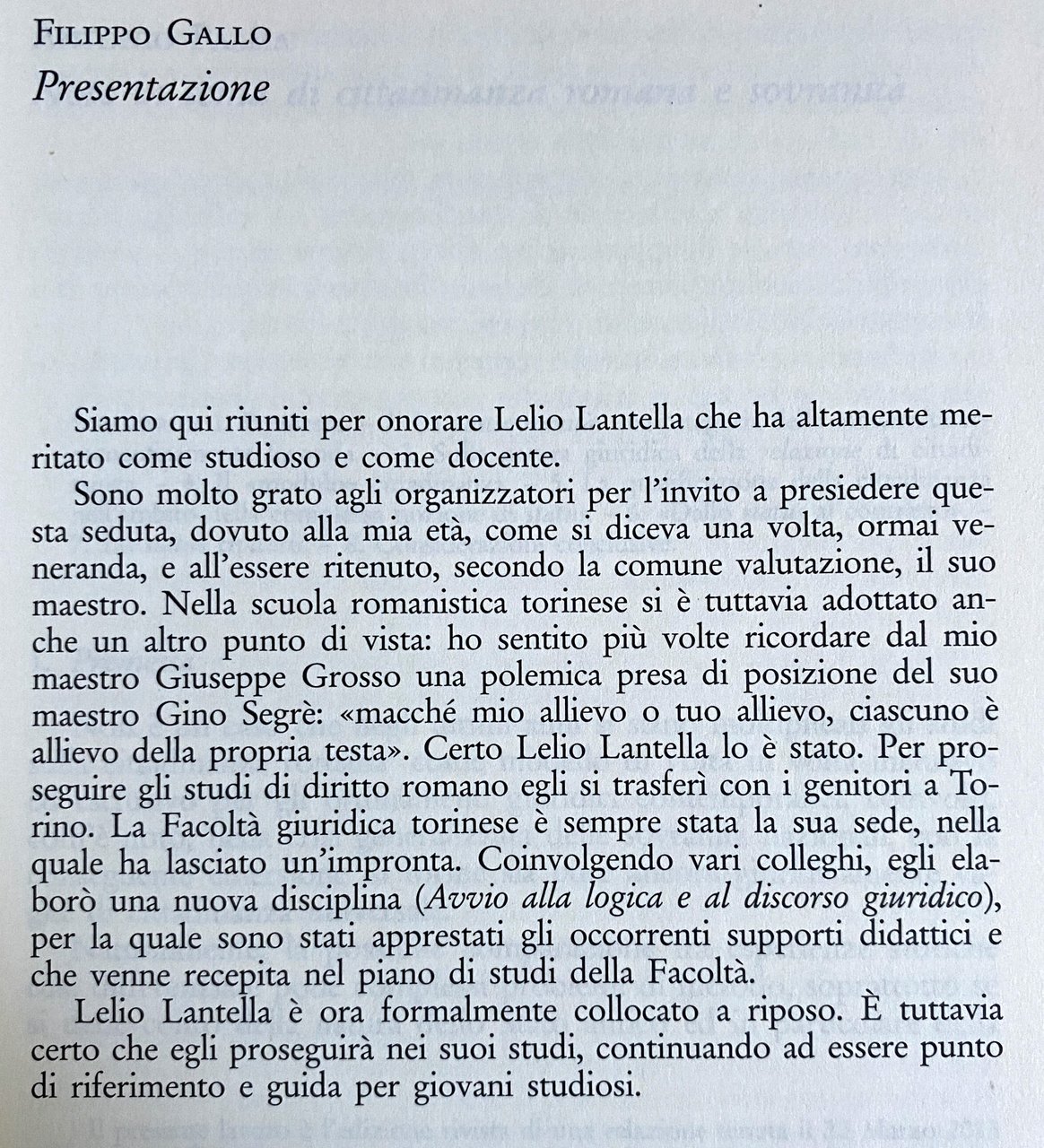 Siamo qui riuniti per onorare Lelio Lantella che ha altamente meritato come studioso e come docente. Sono molto grato agli organizzatori per l'invito a presiedere questa seduta, dovuto alla mia età, come si diceva una volta, ormai veneranda, e all'essere ritenuto, secondo la comune valutazione, il suo maestro. Nella scuola romanistica torinese si è tuttavia adottato anche un altro punto di vista: ho sentito più volte ricordare dal mio maestro Giuseppe Grosso una polemica presa di posizione del suo maestro Gino Segrè: macché mio allievo o tuo allievo, ciascuno è allievo della propria testa. Certo Lelio Lantella lo è stato. Per proseguire gli studi di diritto romano egli si trasferì con i genitori a Torino. La Facoltà giuridica torinese è sempre stata la sua sede, nella quale ha lasciato un'impronta. Coinvolgendo vari colleghi, egli elaborò una nuova disciplina (Avvio alla logica e al discorso giuridico), per la quale sono stati apprestati gli occorrenti supporti didattici e che venne recepita nel piano di studi della Facoltà. Lelio Lantella è ora formalmente collocato a riposo. È tuttavia certo che egli proseguirà nei suoi studi, continuando ad essere punto di riferimento e guida per giovani studiosi.