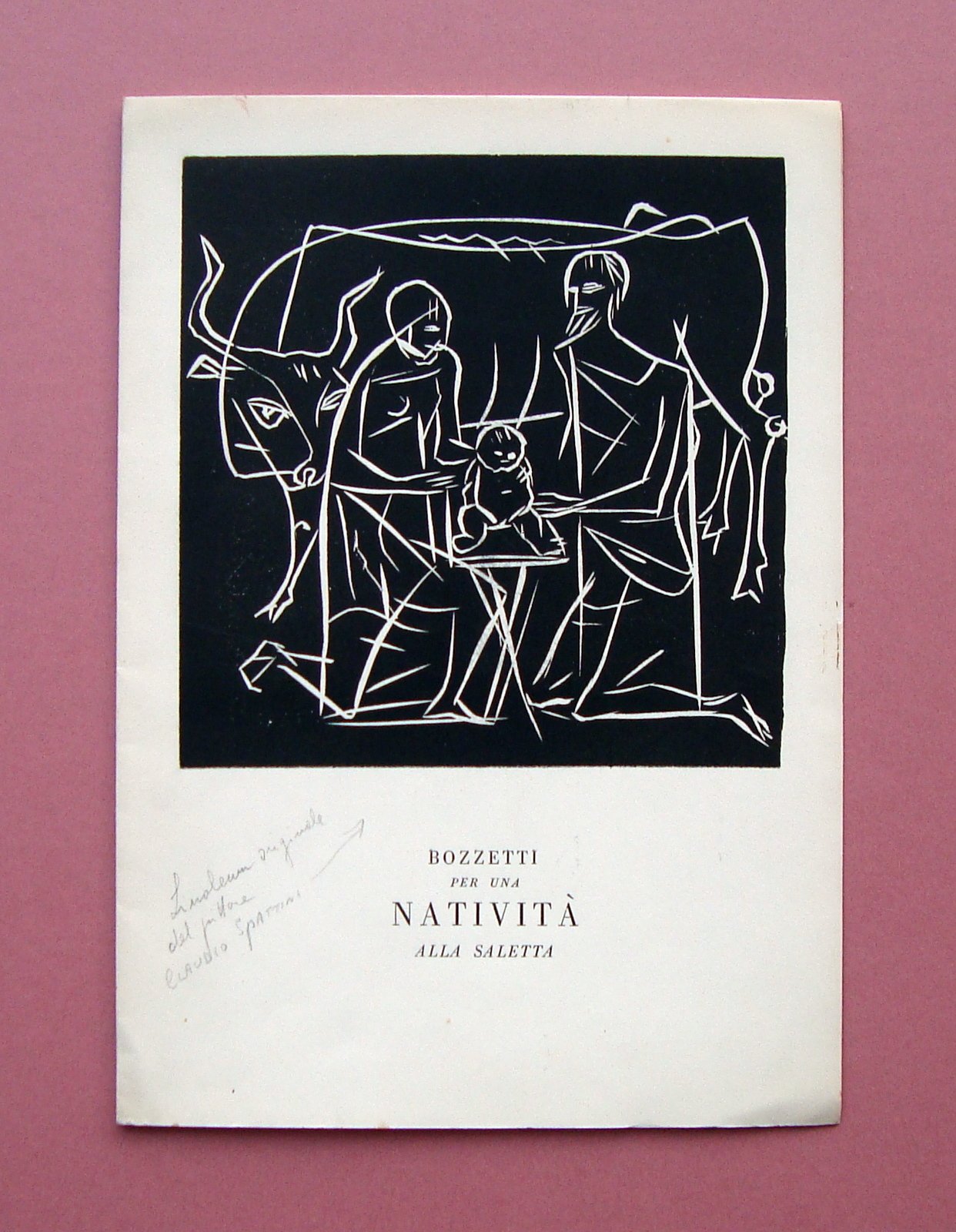 Cartoncino, Bozzetti per una Natività alla Saletta sul frontespizio Un linoleum originale del pittore Claudio Spattini Tip. Bassi e Nipoti, Modena, 1953; cm 25x17,5; catalogo su bifolio (pp. 4 non numerate); al frontespizio linoleum originale in b/n dello Spattini (vedi foto). Condizioni di conservazione Esemplare in buonissime condizioni con leggere bruniture ai margini (vedi foto). SC03.D19053 blu