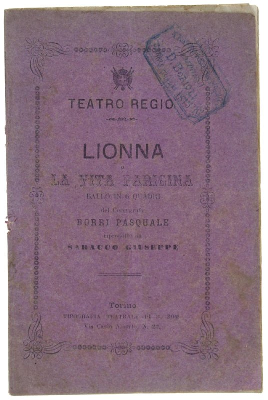 LIONNA o LA VITA PARIGINA. Ballo in 6 quadri.riprodotto da Saracco Giuseppe. Musica del maestro Giacomo Levi da rappresentarsi al Teatro Regio di Torino la Stagione di Carneval-Quresima 1875-76.