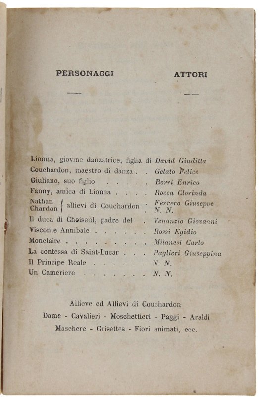 (Codice LJ/0093) In 16° 16 pp. Con i nomi degli attori. Edizione italiana prima e unica. Qualche ingiallitura. Copertina editoriale a stampa su carta viola, timbrino dell'appaltatore. ~~~ SPEDIZIONE IN ITALIA SEMPRE TRACCIATA