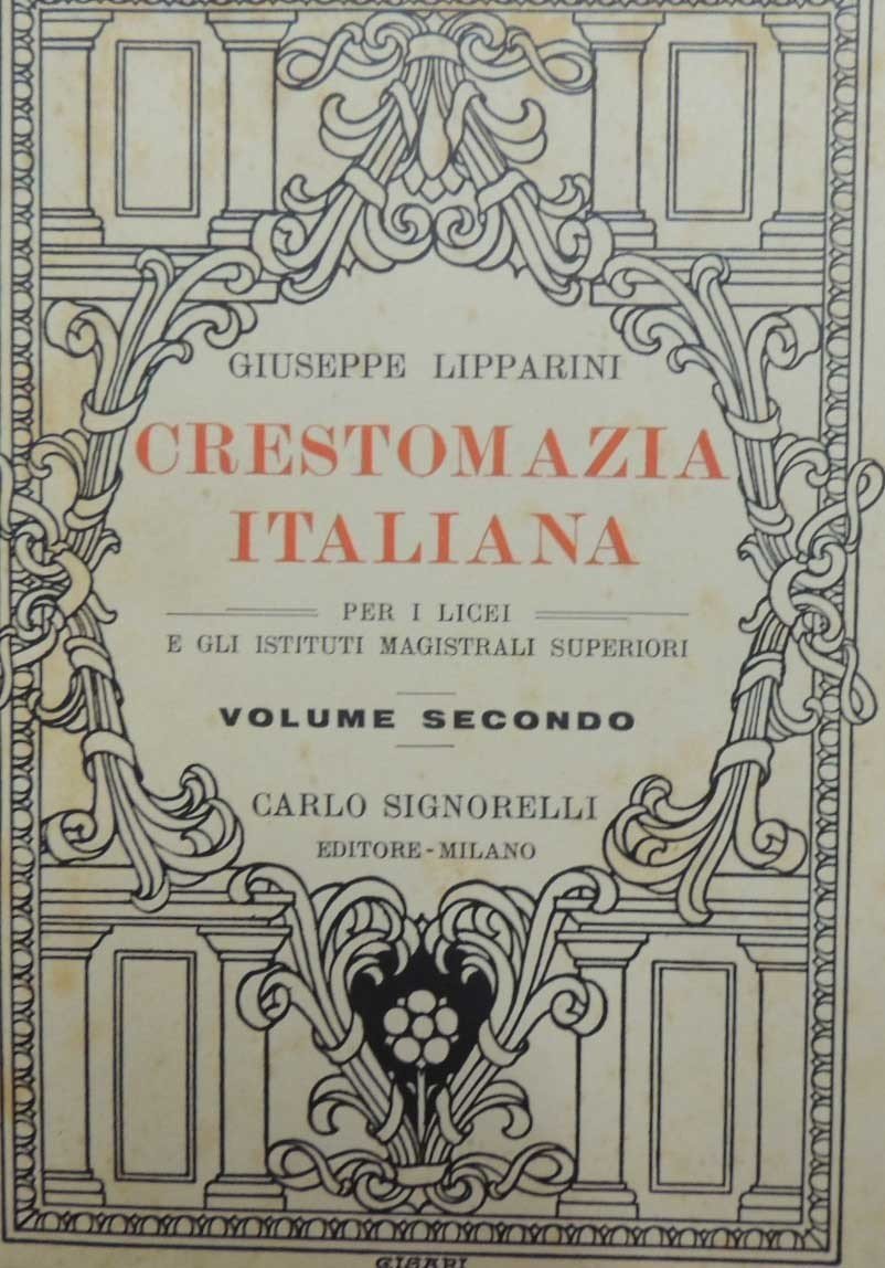 Giuseppe Lipparini, Crestomazia italiana. Per i licei e gli istituti magistrali superiori. Con introduzioni, giudizi, analisi estetiche secondo gli ultimi porogrammi. Volume secondo. Secoli XVI, XVII, XVIII, Carlo Signorelli Editore, Milano 1940, pp. XXIII, 960, cm 20, br. ed. Sottotitolo al dorso: Volume secondo. Il Cinquecento, il Seicento, l’arcadia e il Rinnovamento. Fioriture e ingialliture a brossura e prime e ultime carte, per il resto perfetto. Intonso.