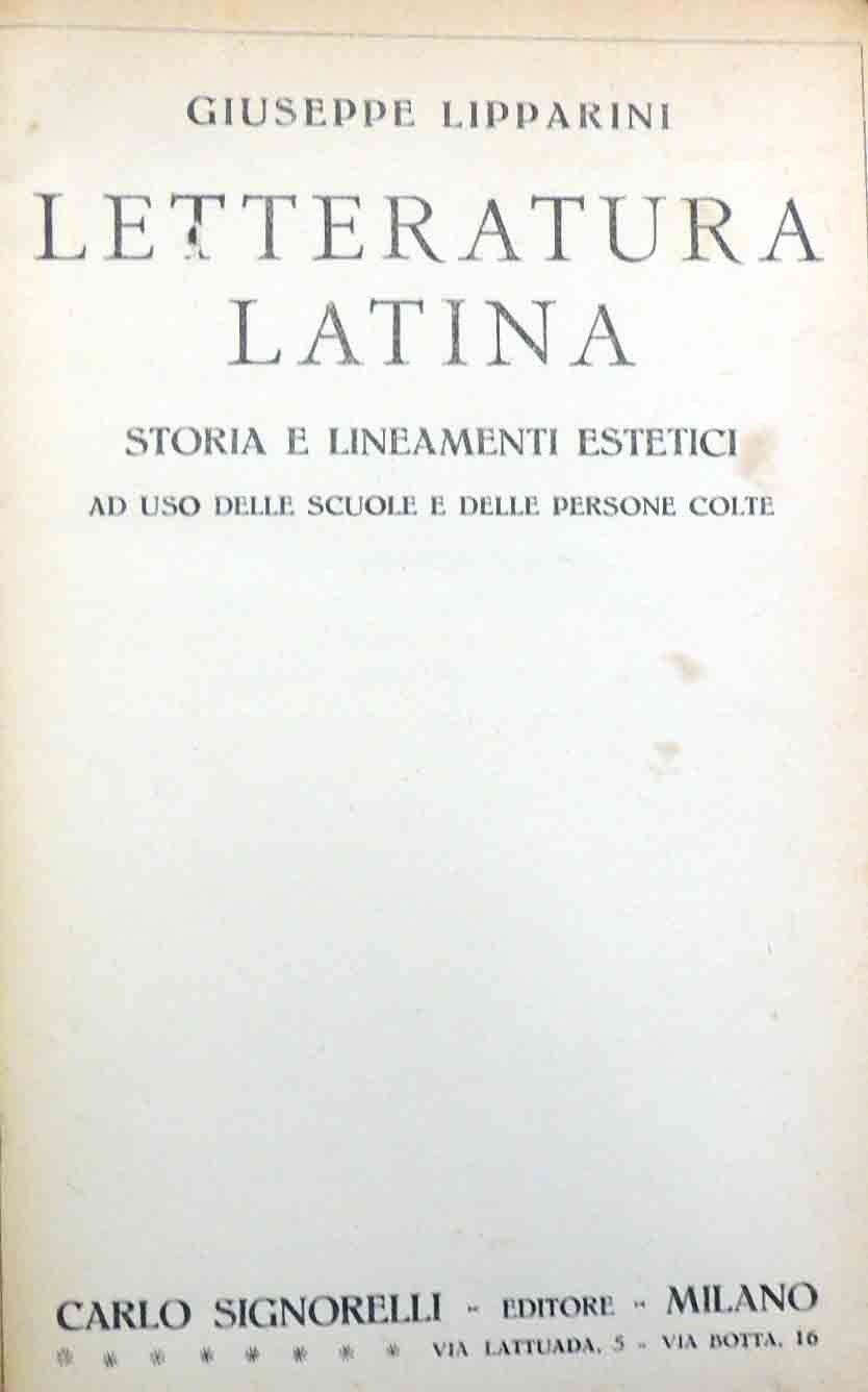 Giuseppe Lipparini, Letteratura latina. Storia e lineamenti estetici. Ad uso delle scuole e delle persone colte, Carlo Signorelli Editore, Milano 1930, pp. 350, testatine ill. b.n., cm 18, legatura coeva in mezza tela blu con titoli il oro al dorso e angoli. All’occhiello, firma d’appartenenza, data e segnatura di collocazione. Piccola abrasione al piatto posteriore, minime fioriture, lievissima brunitura della carta, per il resto bell’esemplare.