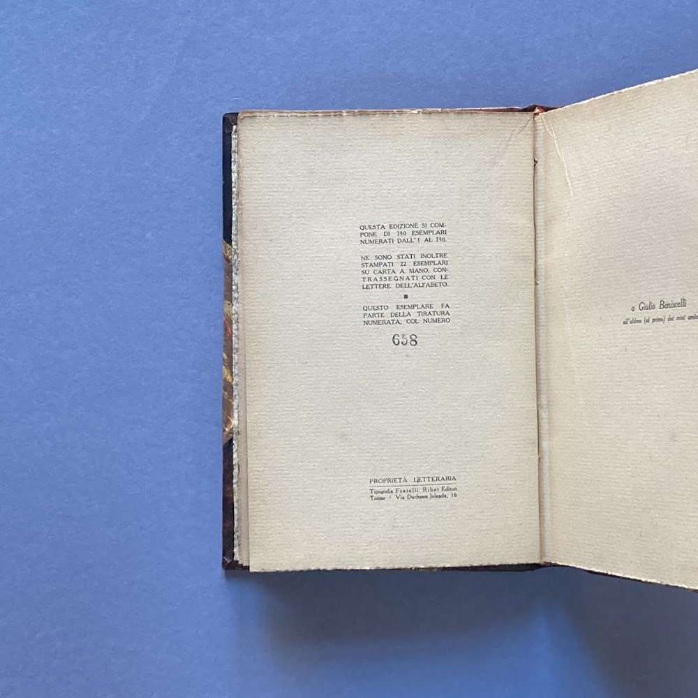 16°, pp. 172 più 4 di catalogo editoriale. Legatura d'amatore in mezza pelle con punte, conservata la brossura originale a due colori con fregio al centro del piatto. Tirato in 750 copie più 22 contrassegnate da lettere dell'alfabeto. Collana: Scrittori Contemporanei, diretta da Mario Gromo. Contiene 11 prose già apparse e 9 inediti. Bell'esemplare seppur leggermente rifilato.