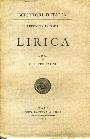In-8°, pp. 379, brossura editoriale grigia. Bell'esemplare in barbe. La raccolta comprende varie liriche in edizione originale; essa contiene anche le liriche latine e quelle apocrife o dubbie. Con nota del curatore, indici dei capoversi e dei nomi. 'Essa rappresenta la migliore edizione critica delle poesie dell'Ariosto, sia per la completezza della raccolta, nella quale sono presenti molti componimenti non mai prima comparsi' (Agnelli / Ravegnani). Scrittori d'Italia. Agnelli / Ravegnani, II, p. 58 (discorre in nota dei principali codici tenuti presenti dal Fatini per la lezione testuale).