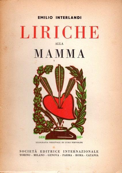 Liriche alla mamma, prima edizione settembre 1950, pp. 39, formato 14 x 20.<BR>Copertina morbida illustrata con una xilografia originale di Luigi Servolini e titoli in nero e arancione al piatto anteriore e in nero sul dorso. In prima pagina presente dedica dell'autore, datato 1 dicembre 1951. <BR>Buone condizioni.