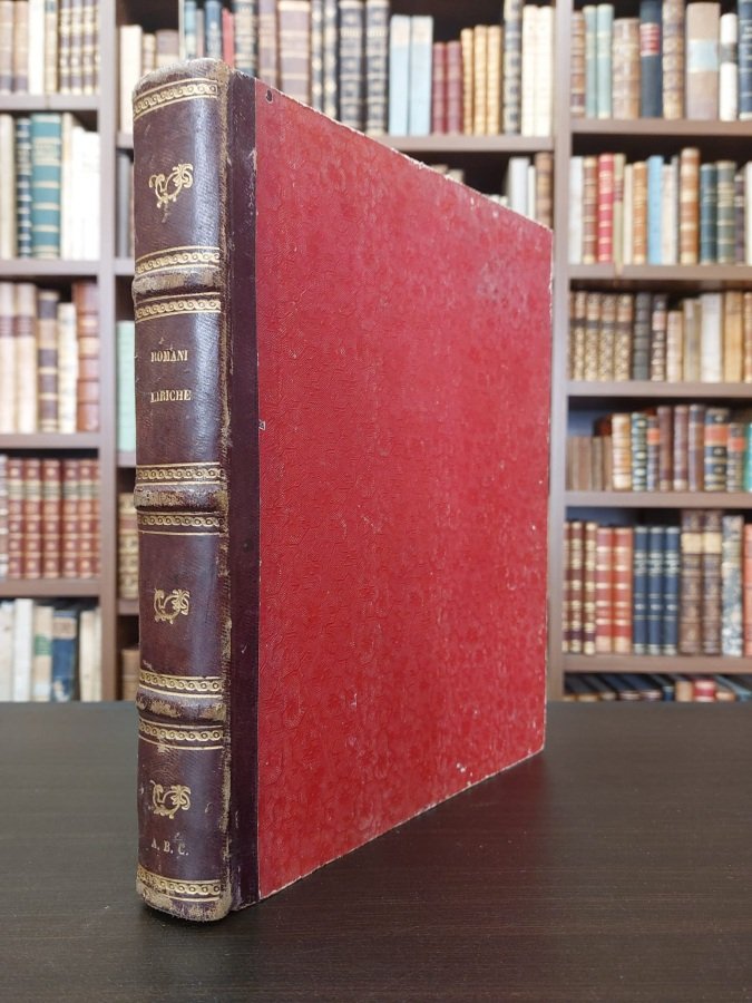 In-4º (cm. 29,5), legatura di poco posteriore in m. pelle con fregi e tit. in oro al dorso (lievi segni d'uso), tagli spruzzati; pp. [14], 400 su carta forte in buono stato, testo incorniciato, finalini; fioriture diffuse. Raccolta dedicata a re Carlo Alberto di tutta la produzione poetica del Romani (1788-1865), per lunghi anni direttore della Gazzetta Piemontese. Edizione originale. Es. elegante, più che discreto. (NJ9)