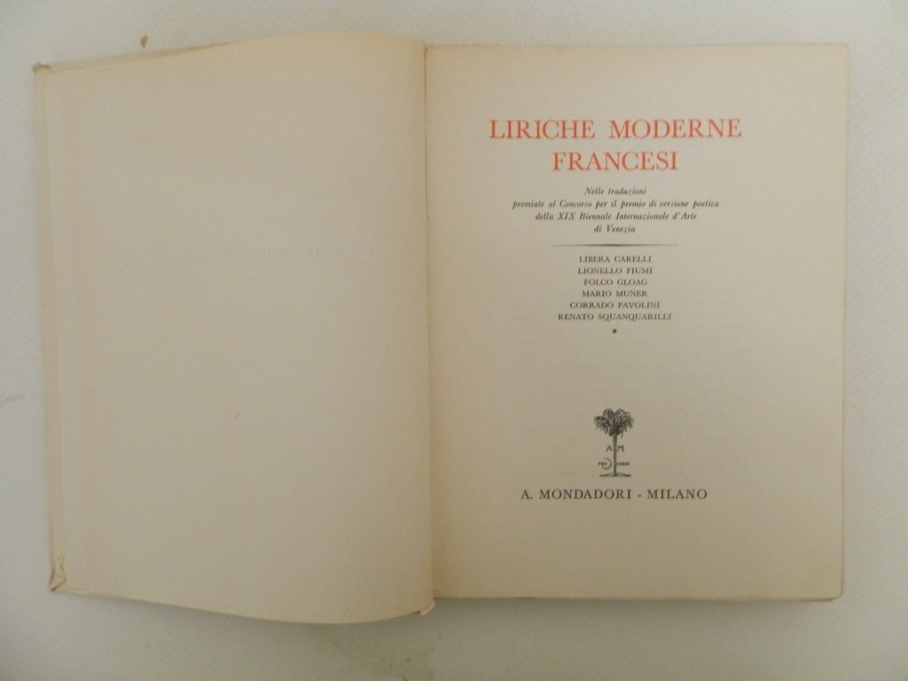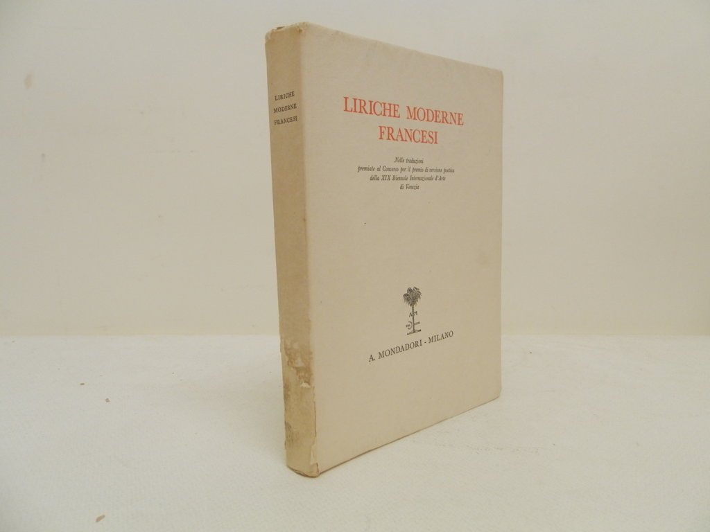 8^, mm 205x155, pp. 323, (5), brossura incamiciata editoriale, ottimo stato di conservazione, piccola signatura al margine superiore della prima carta bianca, strappetto alla cuffia inferiore ed al margine superiore. Prima edizione italiana, nelle traduzioni premiate al Concorso per il premio di versione poetica della XIX Biennale Internazionale d'Arte di Venezia, traduzioni di Libera Carelli, Lionello Fiumi, Folco Gloag, Mario Muner, Corrado Pavolini, Renato Squanquarilli su opere di Francis Iammes, Jules Superville, Paul Valery, Artur Rimbaud, Paul Verlaine.. *** TUTTI I NOSTRI LIBRI SONO VISIBILI PREVIO CONTATTO MAIL O TELEFONO NELLA NUOVA SEDE DI MILANO: LIBRERIA COSMOPOLIS, VIA JOMMELLI, 22. ***