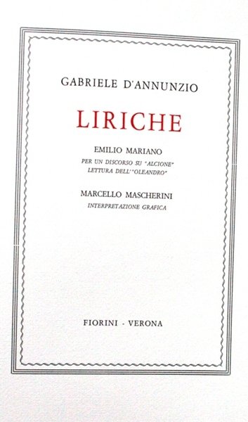 copertina macchiata; Acqueforti originali firmate di Marcello mascherini; 136 pag in perfetto stato; edizione pregiata di 259 esemplari numerati a macchina (n.188)e nominati ad personam su carta Fedrigoni; la libreria possiede della stessa serie:STRENNE FIORINI IN EDIZ. LIMITATA - La Salmace ed altri idilli barocchi ; acqueforti di Ada Zanon; € 80 - La poesia di Ugo Foscolo; acqueforti di luigi M. Veronesi; € 80 - Le parabole di nostro signore Gesù Cristo; a.forti Domenico Zangrandi; € 80 - Sant’Ambrogio: Hymni; illustrazioni di Eugenio Tomiolo; € 80 - Ausonio: Carmi; litografie di Giuseppe Ajmone; € 80 - Poesia Nederlandese; acqueforti di Johan Breuker; € 80 - Virgilio: Georgiche; litografie di Renzo Sommaruga; € 80 - Sofocle: Antigone; acqueforti di Ernesto Treccani; € 80 - Il treno; illustrazioni di Renato Di Bosso (futurista); € 80 - La vanità e le rose; acqueforti di Moreno Zoppi; € 80 - Ritsos: Elena; illustrazioni di Davide Antolini; € 80 - Poesia giocosa; litografie di Remo Brindisi; € 80 - D’Annunzio: Liriche; interpretazione grafica Marcello Mascherini; € 50 [copertina macchiata] EDIZIONI FIORINI RILEGATI ediz.limitata - Bergamino da Mantova e Cangrande della Scala; acquaforte di Francesco Arduini; € 50 - Alfieri e Pindemonte alla presa della Pastiglia; acquaforte di Francesco Avesani; € 50 - Orazioni inedite in volgare veronese del secolo XIV; xilografia di Pietro Volpin; € 50.