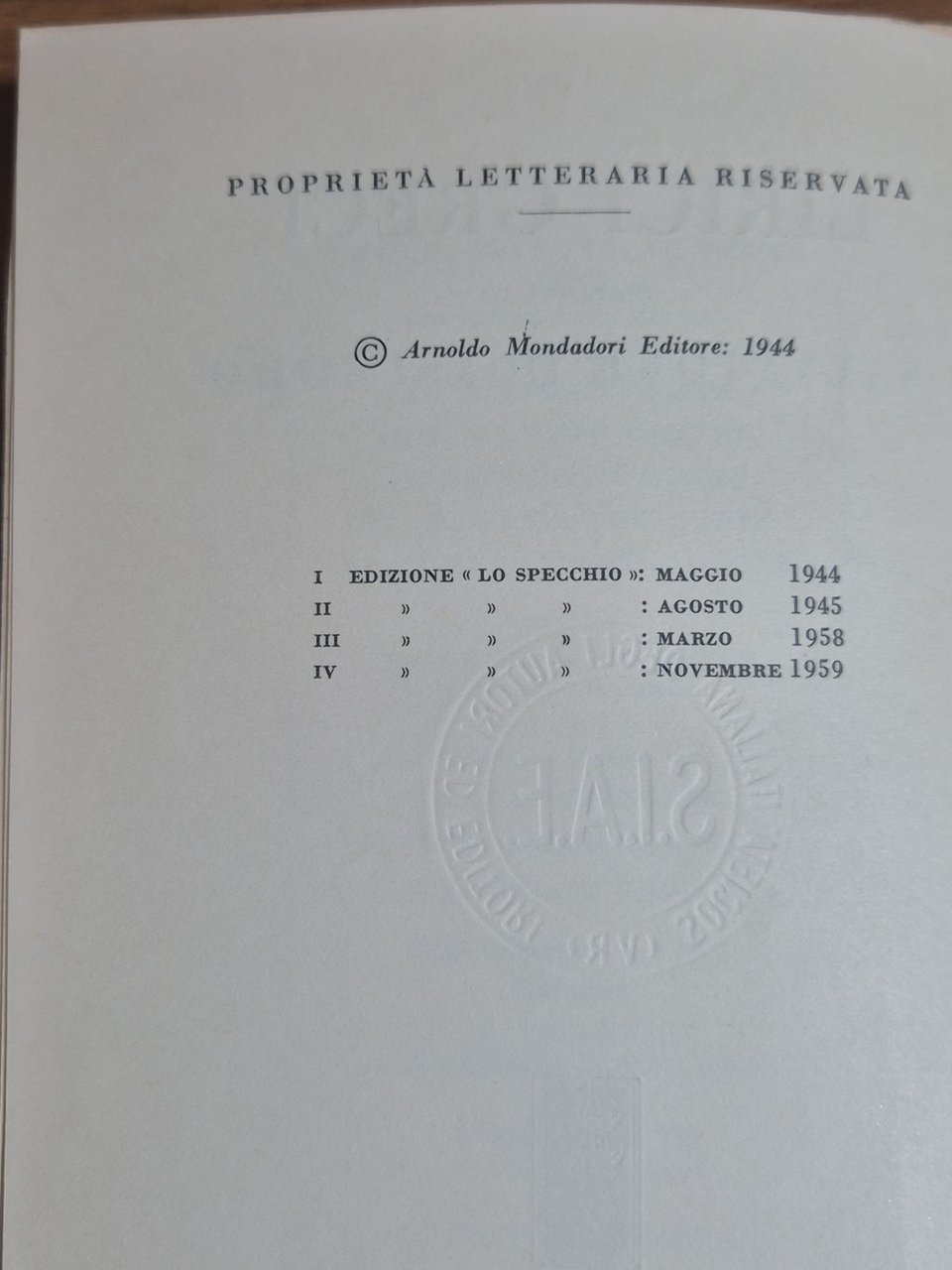 Mondadori Editore Lo specchio IV edizione 1959. 226 pagine. Copertina editoriale in brossura e sovraccoperta in carta oleata, conserva fascetta editoriale. Stato di conservazione: molto buono (pagine normalmente ingiallite, piccole imperfezioni alla copertina) Libro usato letteratura italiana poesia