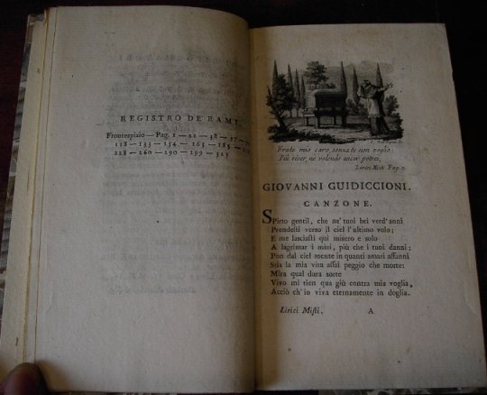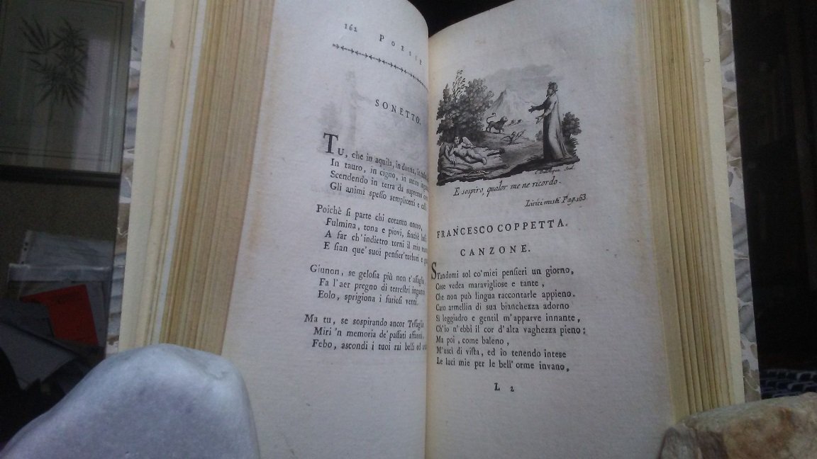 Volume in 8 legato in mezza pelle, titolo al tassello al dorso, sguardie, occhiello, frontespizio ornato da medaglione, due carte, 389 pp., vignette in rame nel testo. Notevole raccolta di componimenti poetici d'Autori cinquecenteschi. Particolare cura nell'impaginazione e stampa, una stringata ma puntuale biografia dei Poeti presente al fondo del volume, deliziose e fresche le vignette in rame. In pi che bello stato, di scarsa reperibilit.