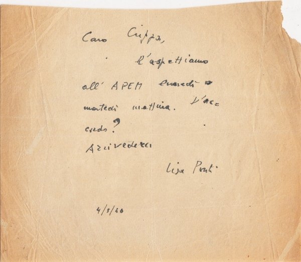 invito manoscritto e firmato di Lisa Ponti che scrive all'artista Renato Crippa; invito datato 4 Maggio 1946; buon es.