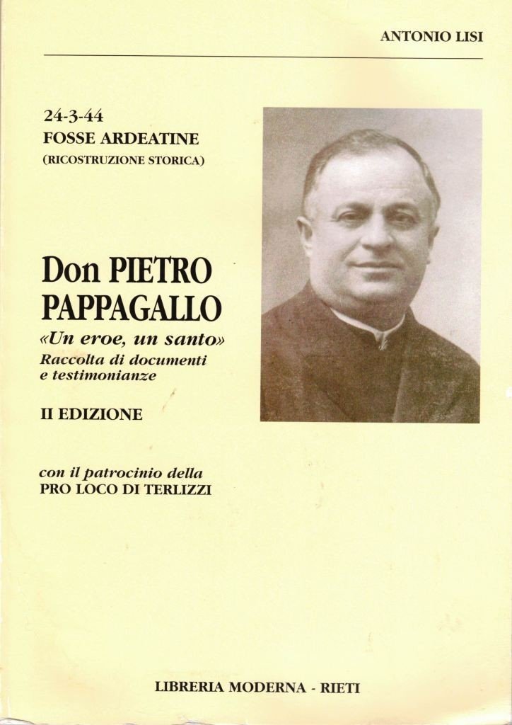 Antonio Lisi, Don Pietro Pappagallo. Un eroe, un santo. 24-3-1944 Fosse Ardeatine (Ricostruzione storica), Libreia Moderna, Rieti 2009, ristampa seconda ed., pp. 318, ill. b.n., cm 23, br. ed. In calce al frontespizio: Col patrocinio dell’Associazione Turistica Pro-Loco – Terlizzi. Raccolta di documenti e testimonianze. Indice: Premesse (Testamento spirituale del Generale dell’Aeronautica Sabato Martelli Castaldi, caduto alle Fosse Ardeatine. Da Via Tasso di Arrigo Paladini – Appello alle competenti Autorità e agli Enti preposti: una lapide che lo ricordi - Dediche a mia madre e agli Eroi della Resistenza – A Lucia Ottobrini, medaglia d’argento al V.M. – Un comandante della Resistenza, Mario Fiorentini, tre medaglie d’argento, oggi docente universitario di matematica: una proposta per la medaglia d’oro (di Alfio Marchini e Giorgio Amendola) – A Carlo Jani – Presentazione di Franco Dello Russo, Presidente dell’Associazione Turistica ProLoco di Terlizzi – Don Pietro Pappagallo. Un Eroe, un Santo. La figura di Don Pietro. Tre punti di vista: Don Gaetano Valente, Elvira Sabbatini Paladini, Gabriele Di Giammarino – Intervista con l’autore dle libro) – Capitolo I. L’unico scampato al massacro Joseph Reider e Don Pietro erano legati insieme per i polsi. Ma i loro polsi si liberarono e una mano potè benedire e assolvere. Fu un miracolo? – Capitolo II. Per conoscerlo meglio. Testimonianze (Antonio Lisi, Chi era Don Pietro – Tonino Pappagallo, Mio zio Pietro – Pietro Marino, Un sacerdote ci aiuta a non dimenticare – Michele Gargano, Pane e cipolla e santa libertà – Michele Signorile, Nel turbine – Vito Bernardi, Uomo di Dio e uomo degli altri – Nicola Roselli, Don Pietro Pappagallo martire delle Fosse Ardeatine – Nicolò Cantatore, Commemorazione del 24 aprile 1959 – Oscar Careggi, Gli ultimi giorni di una vittima) – Capitolo III. Alla scuola elementare il suo nome: 20/11/1957. Tutti i documenti – Capitolo IV. 1944-1994. Cinquant’anni dopo nella scuola che porta il suo nome – Capitolo V. Il processo al delatore. I personaggi: Teresa Nallo, Gino Crescentini – Capitolo VII. Antonio Lisi, Martiri delle Fosse Ardeatine. Don Pietro Pappagallo. Un eroe, un santo, con prefazione di Leonardo Azzarita (ristampa della prima ed. 1963) – Capitolo VIII. Documenti (Gioacchino Gesmundo, Dell’opera storiografica di Guido De Ruggiero – Id., Con Ugo Spirito, oltre l’idealismo – Id., Echi della crisi del liberalismo – Intervista al comandante dei G.a.p. Mario Fiorentini) – Capitolo IX (La tomba di Don Pietro alle Fosse Ardeatine – Elenco delle 335 vittime – Il processo a Crescentini. La sentenza a stampa e in originale – Documentazione fotografica: L’arrivo della salma a Terlizzi – I funerali, 7 novembre 1948). Leggere tracce d’uso, un segno di piega alla copertina posteriore, minimo alone di gora a margine delle prime carte, per il resto ben conservato.
