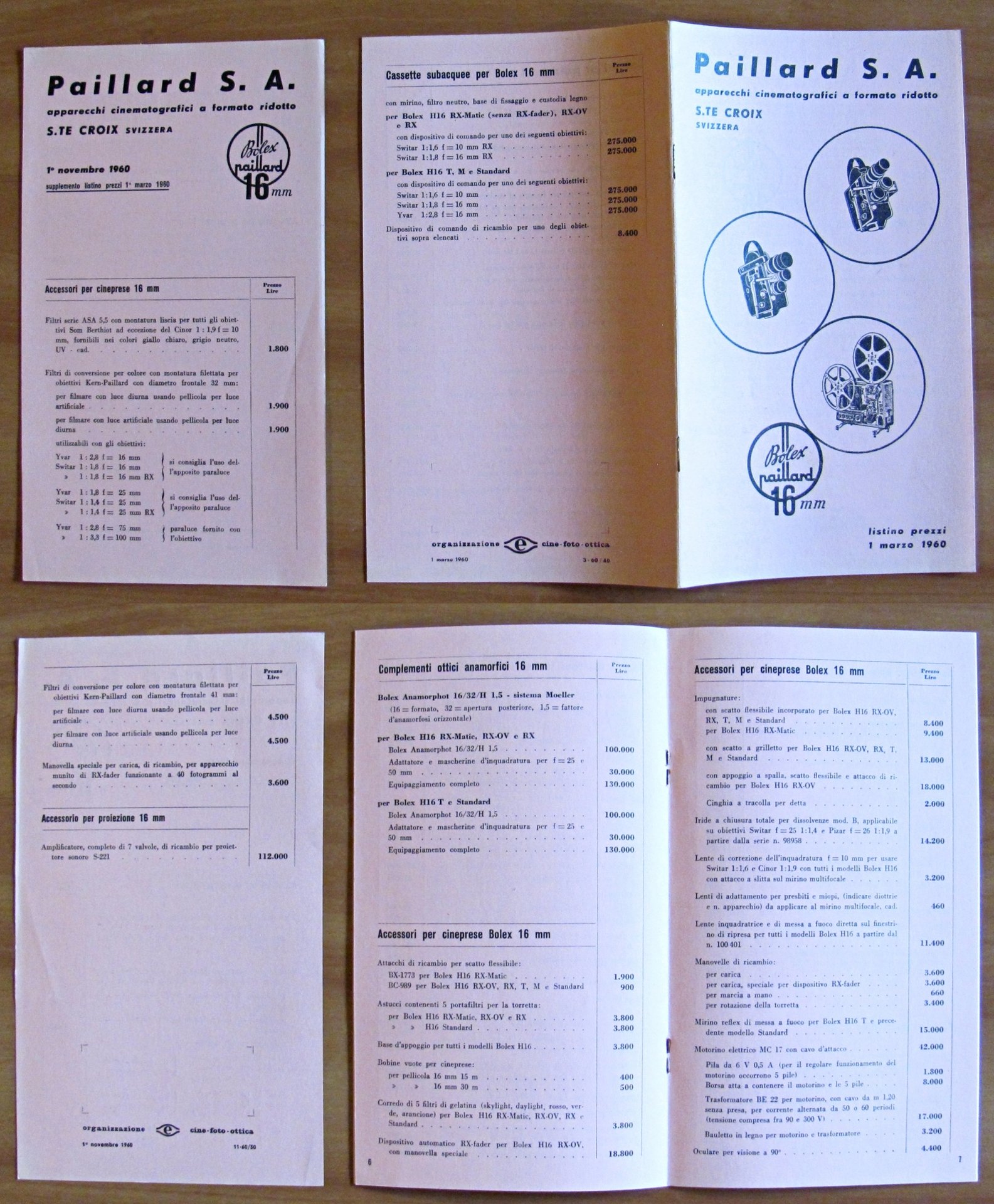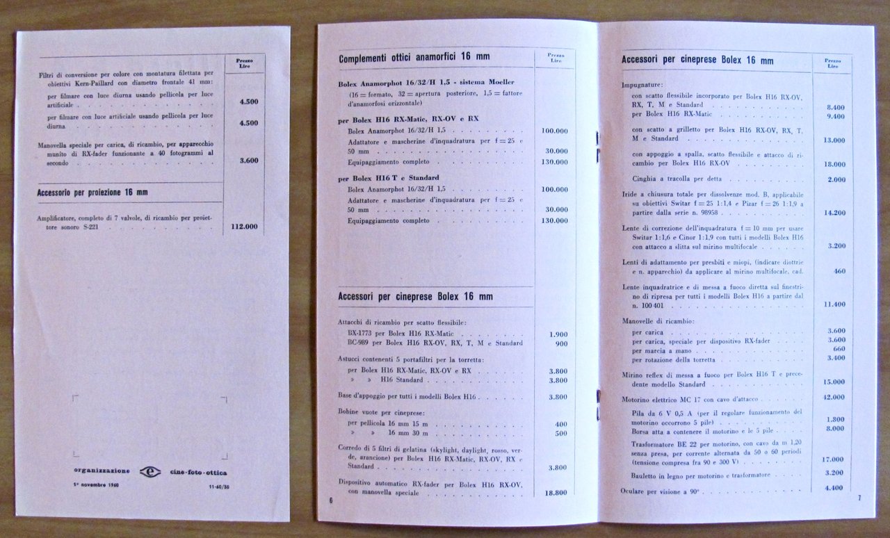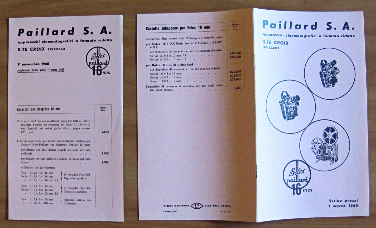 Bolex Paillard. Listino prezzi 1 Marzo 1960 + Supplemento del 1 Novembre 1960. Organizzazione Cine - Foto - Ottica - Novembre 1960. Brossura editoriale. 12x21; pp.11 + Supplemento. Ottimo stato. , Ottimo (Fine)