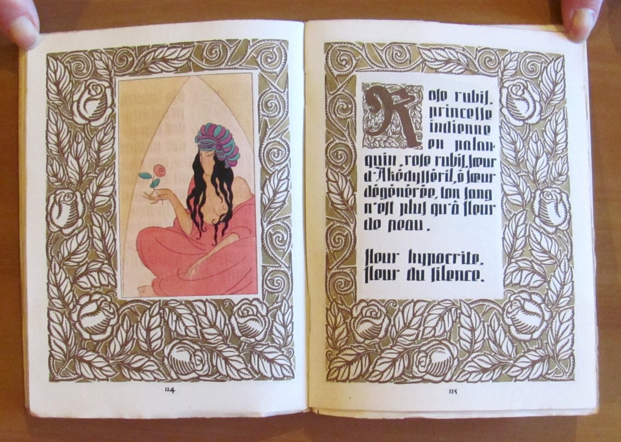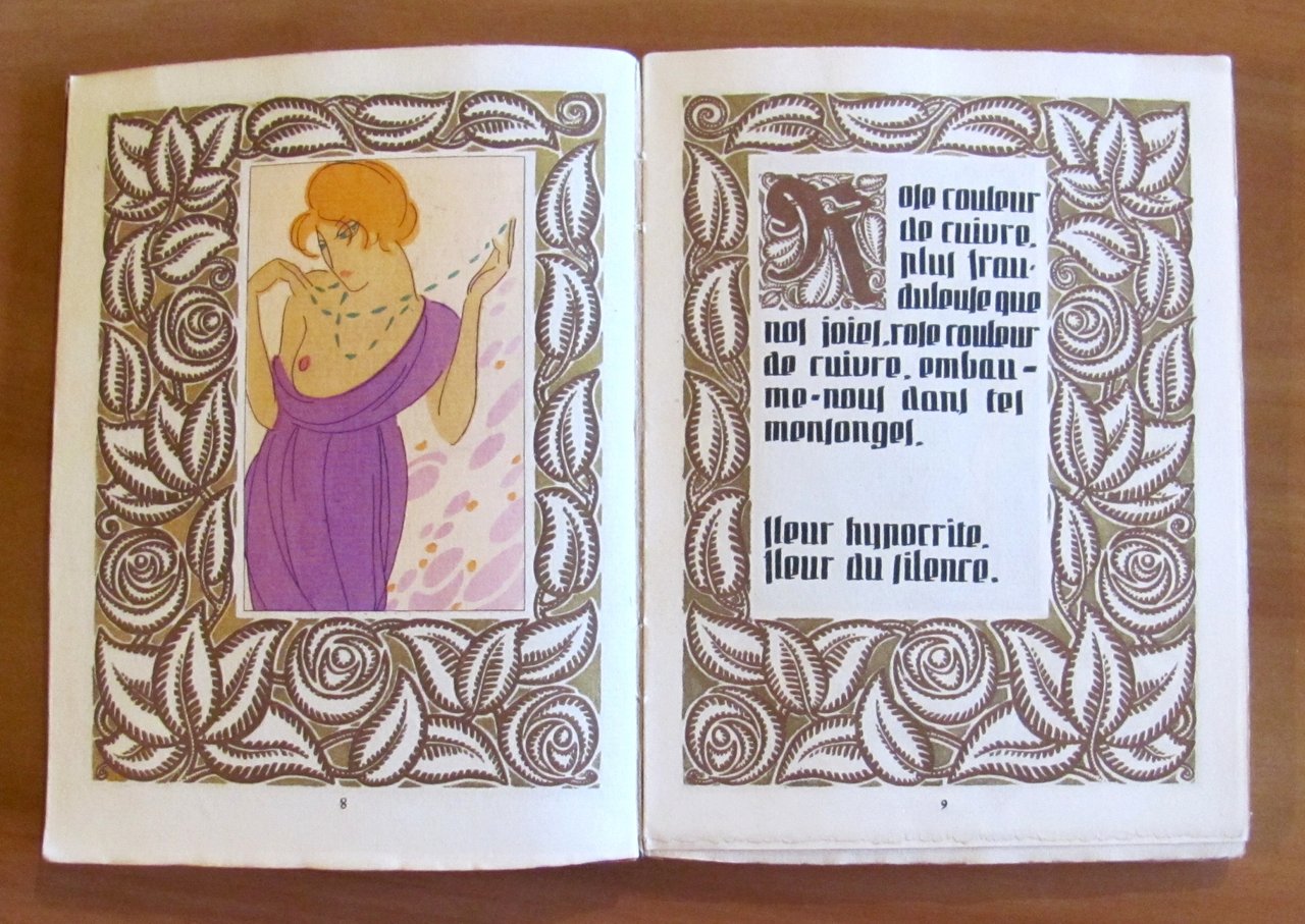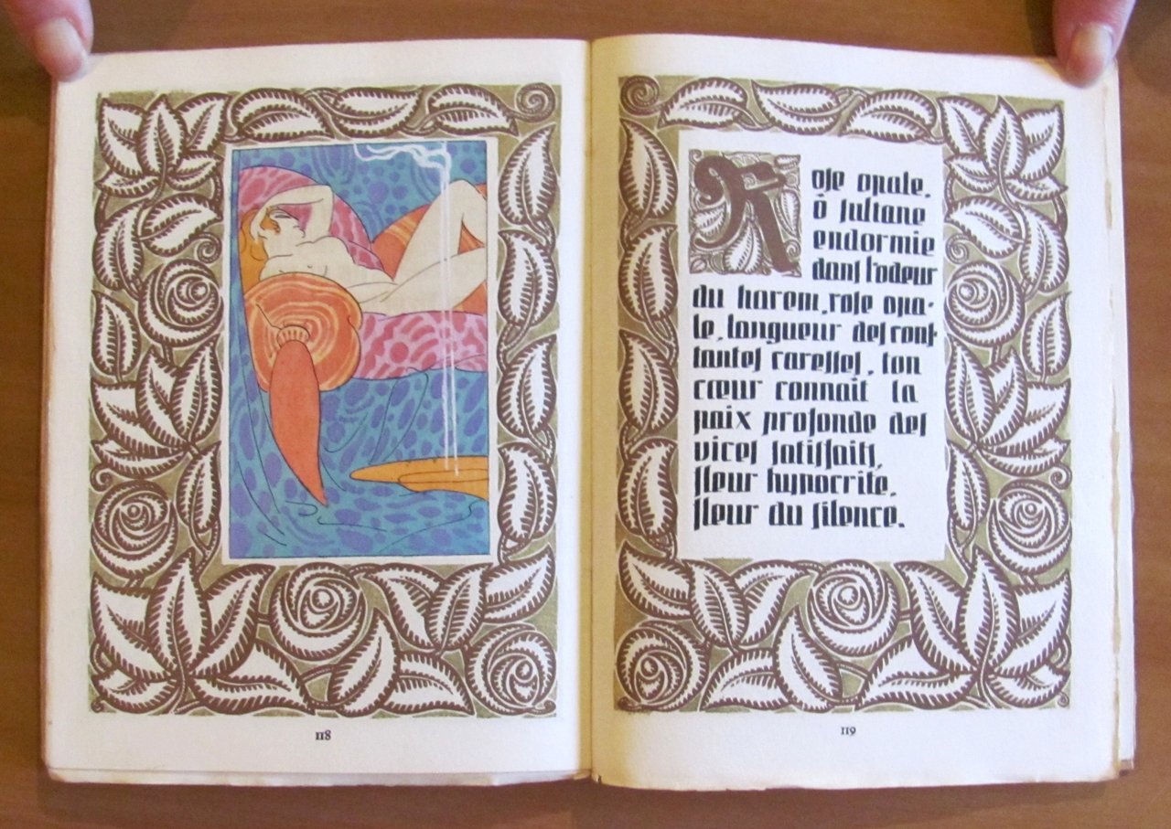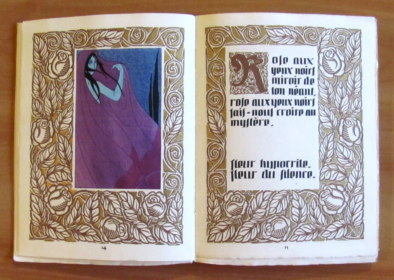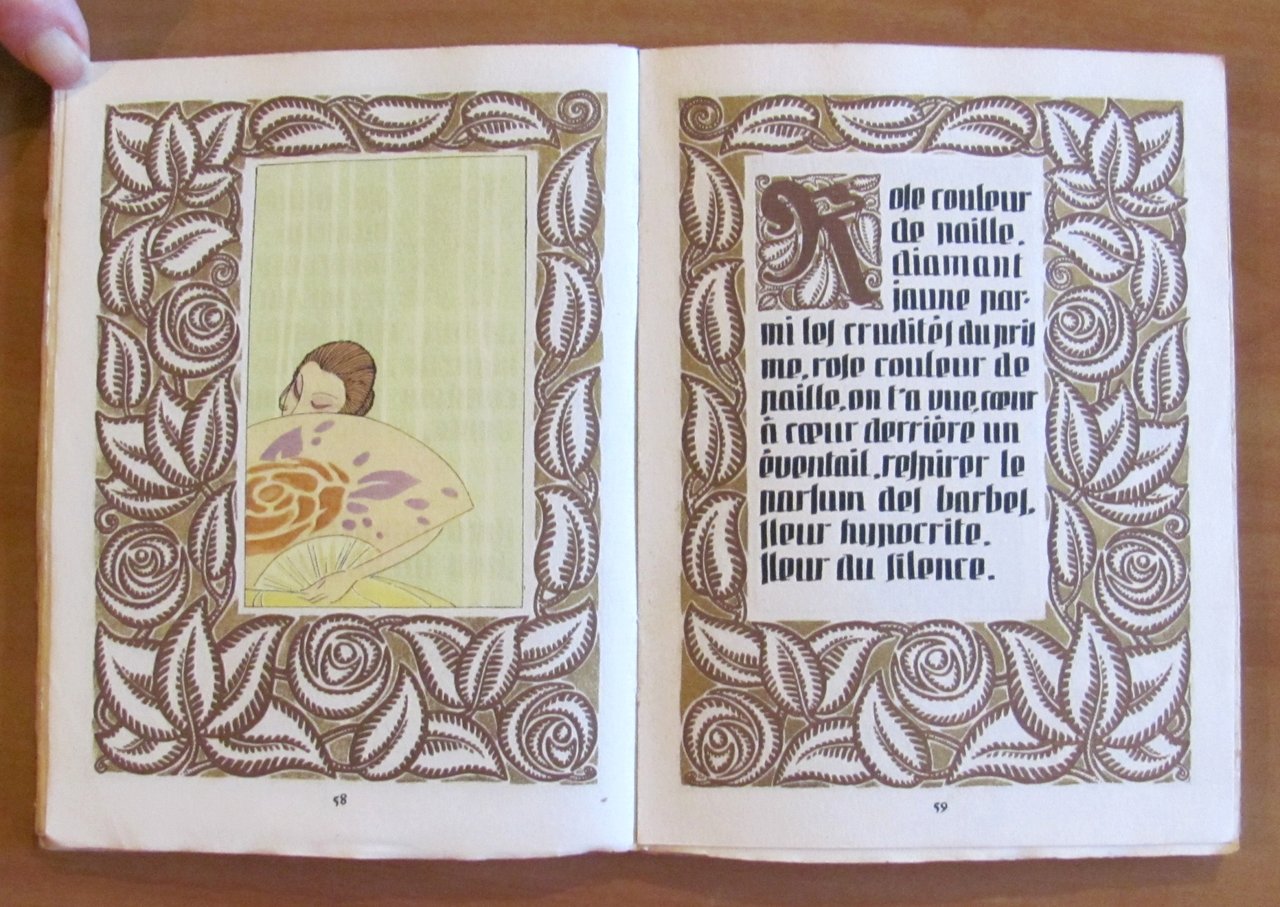 59 splendide illustrazioni a colori e delicate decorazioni in cornice su fondo oro a tutte le pagine, tutto in Stile Art Deco' di André Domin. Editions René Kieffer - Paris, I edizione 1919. Edizione in Tiratura Limitata a 500 esemplari numerati su vélin, nostro N.237. Brossura editoriale con ali con titoli in nero al piatto. 12,5x17; pp.128. Raro e Splendido esemplare. , Ottimo (Fine)