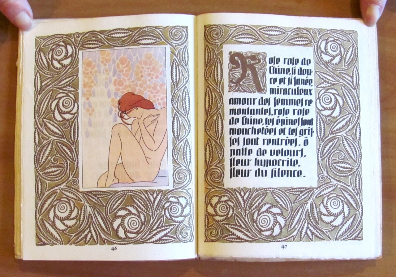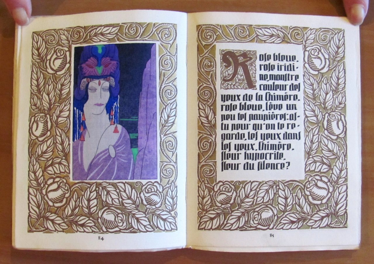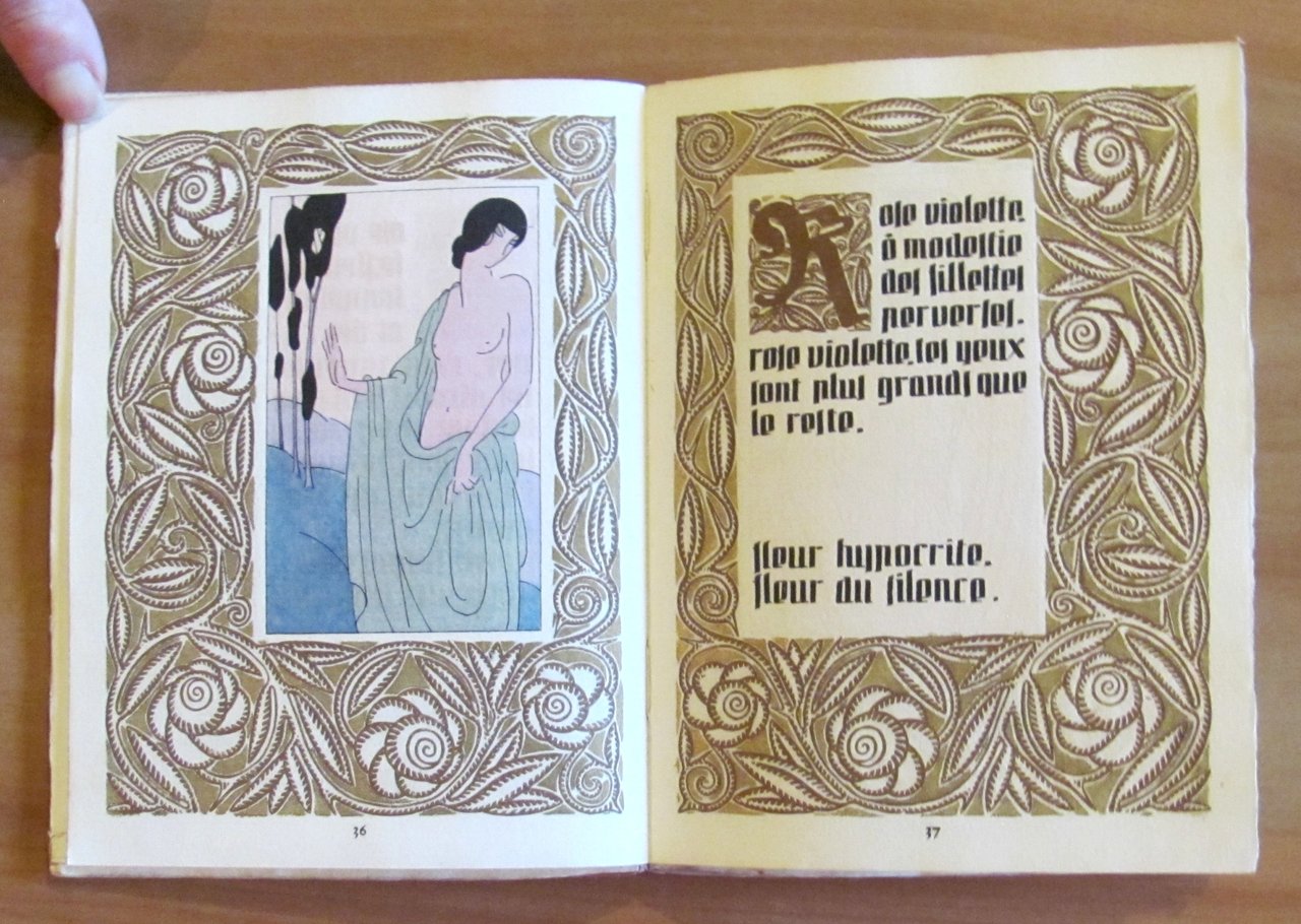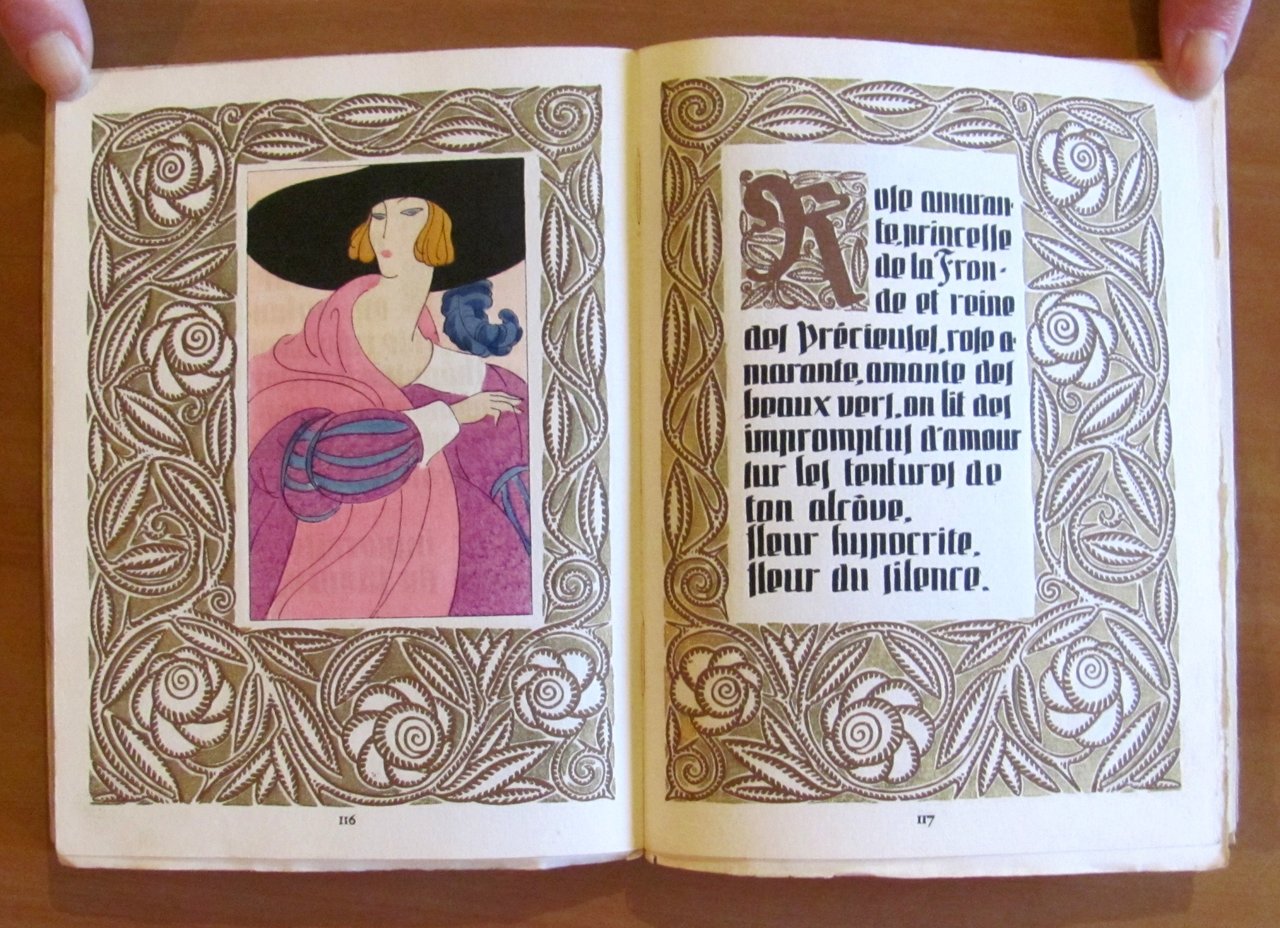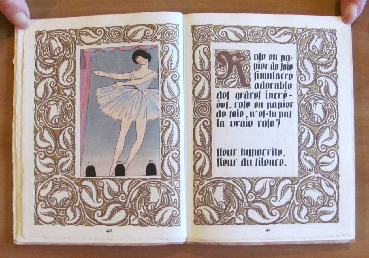 59 splendide illustrazioni a colori e delicate decorazioni in cornice su fondo oro a tutte le pagine, tutto in Stile Art Deco' di André Domin. Editions René Kieffer - Paris, I edizione 1919. Edizione in Tiratura Limitata a 500 esemplari numerati su vélin, nostro N.237. Brossura editoriale con ali con titoli in nero al piatto. 12,5x17; pp.128. Raro e Splendido esemplare. , Ottimo (Fine)