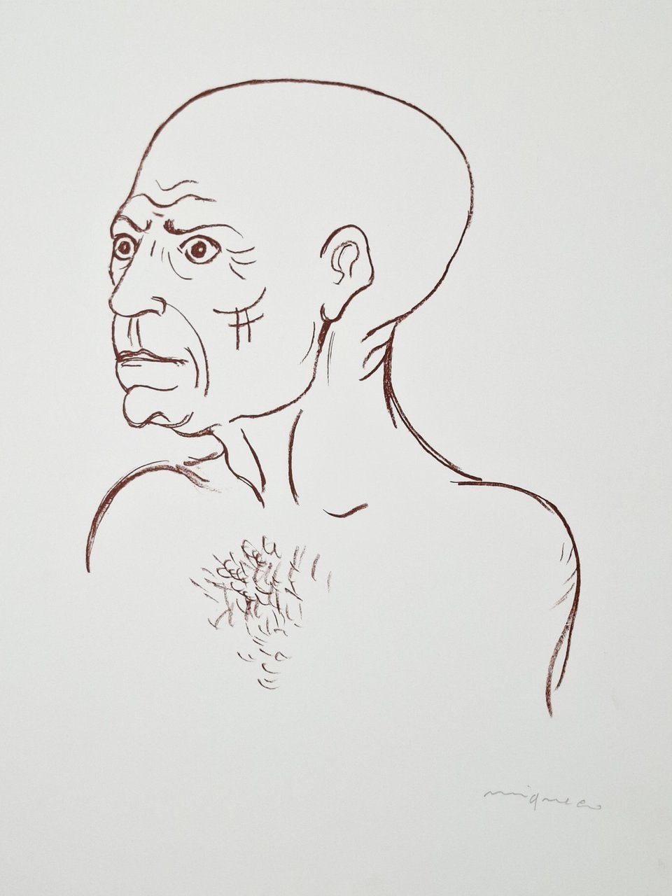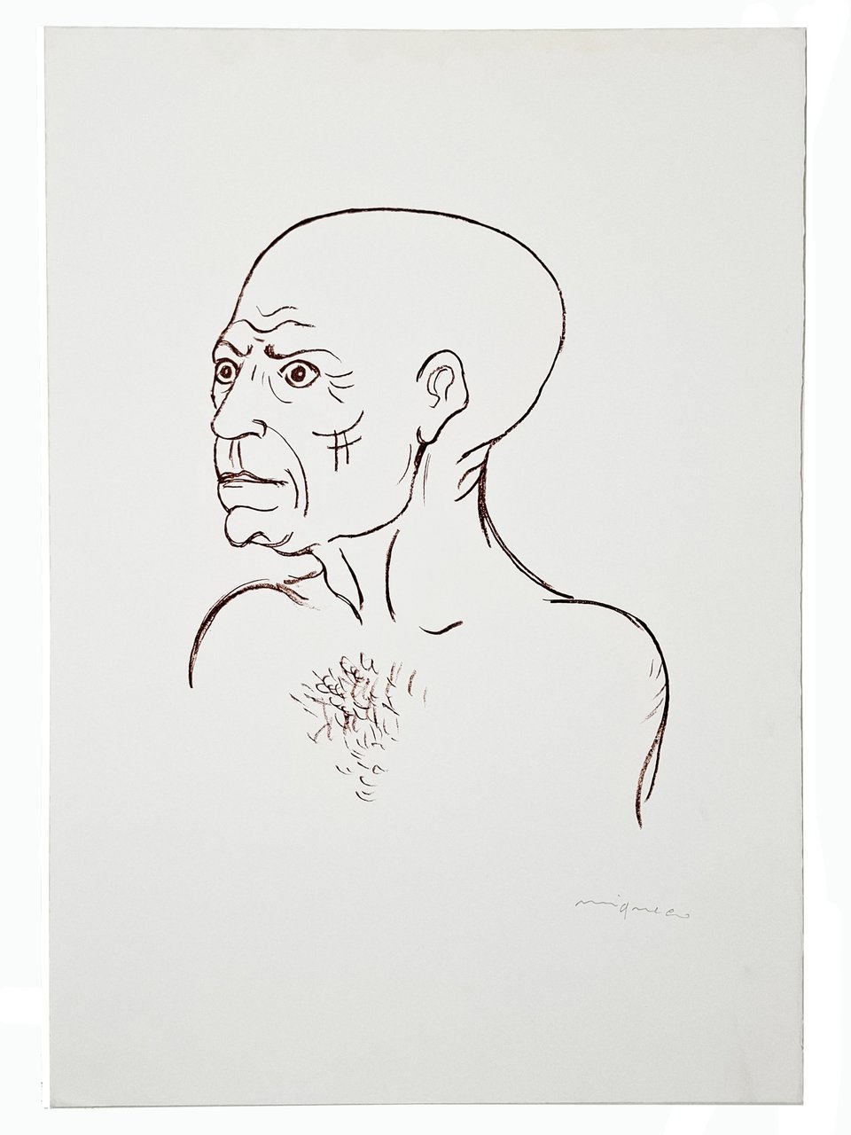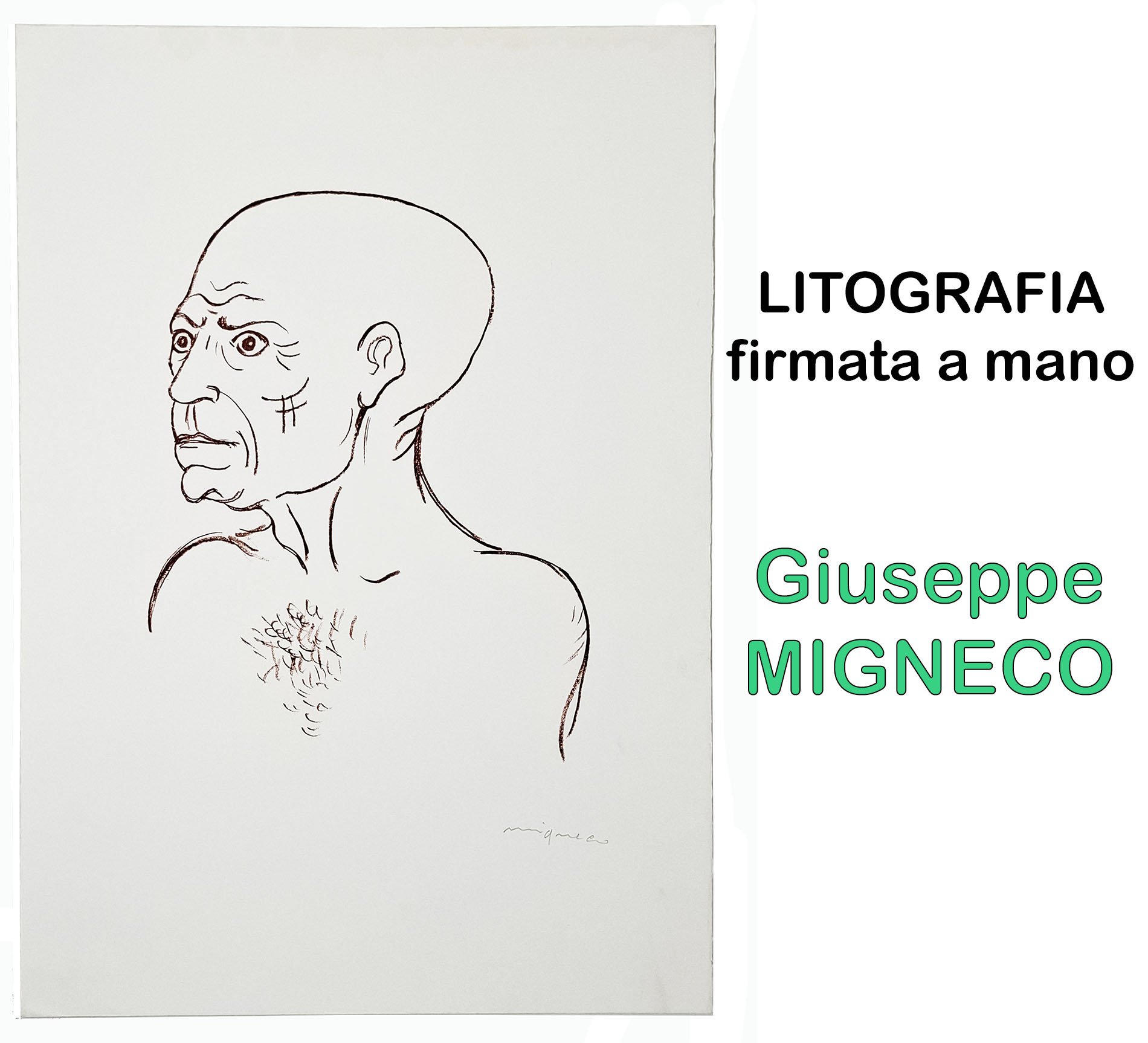 Litografia firmata a matita dall'autore: Migneco, omaggio a Picasso. Su foglio di carta spessa con margini. Dimensioni del foglio: 50,5 x 35,5 cm circa. Stato di conservazione: ottimo. Giuseppe Migneco (Messina 1903 - Milano 1997) è stato uno dei maggiori pittori espressionisti del Novecento italiano. Migneco firma questa potente rappresentazione, dove il volto di Picasso diventa specchio dell'animo e della società, in un equilibrio perfetto tra rigore e sentimento.