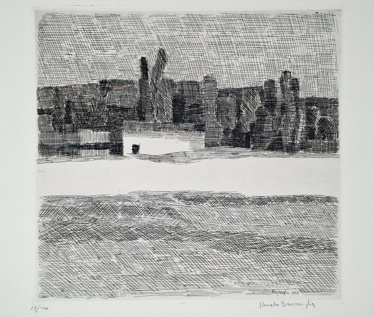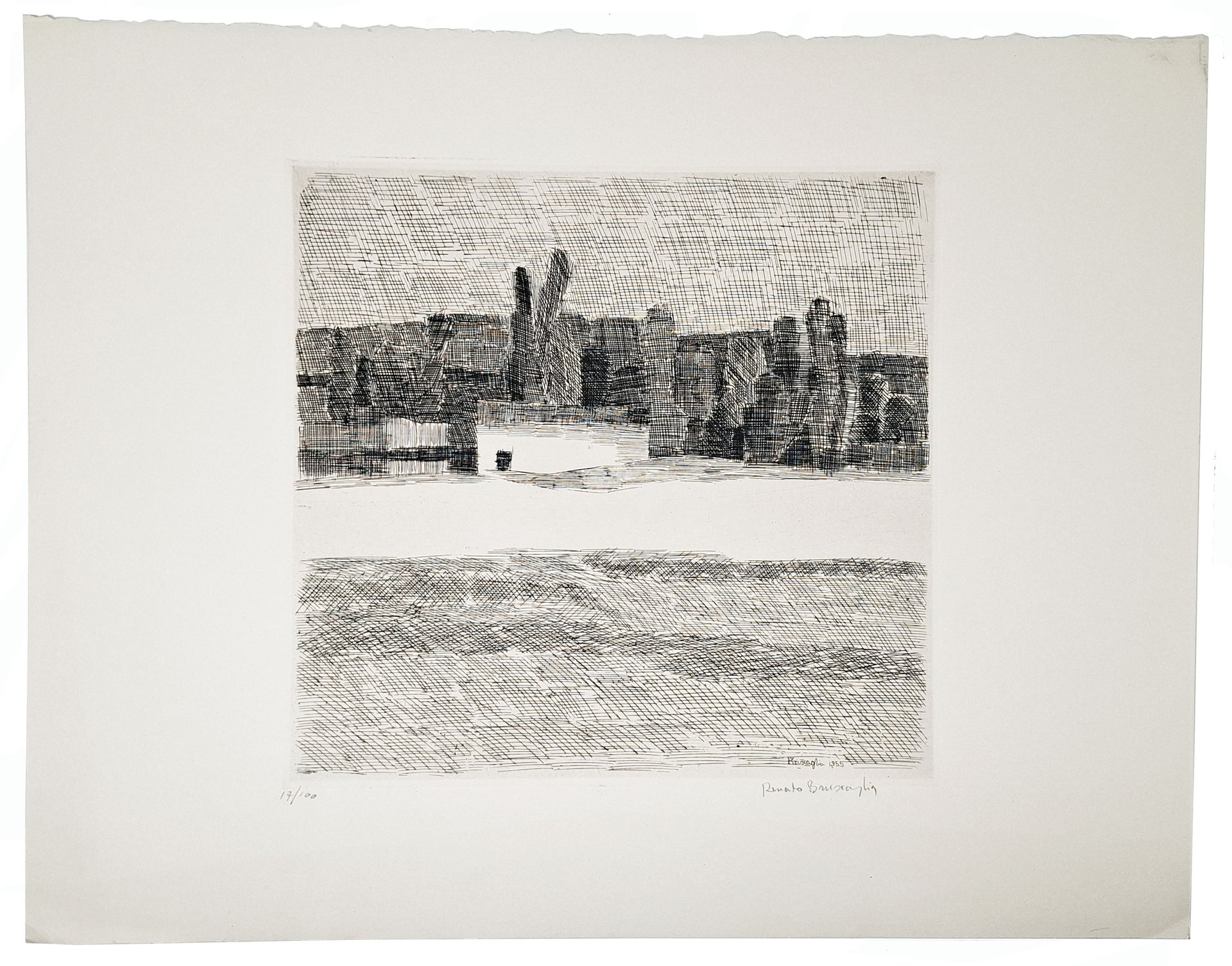 Litografia in nero, su carta spessa, incisione a torchio. Numerata in basso a sinistra (17 / 100) firmata e datata in lastra e nuovamente firmata a matita dall'artista Renato Bruscaglia (Urbino 1921 - Bologna 1999). Dimensioni del foglio: 50 x 39 cm circa. Dimensioni della battuta: 28,5 x 27 cm circa. In perfetto stato di conservazione. Importante artista protagonista in alcune delle più importanti esposizioni di grafica di grafica in Italia.