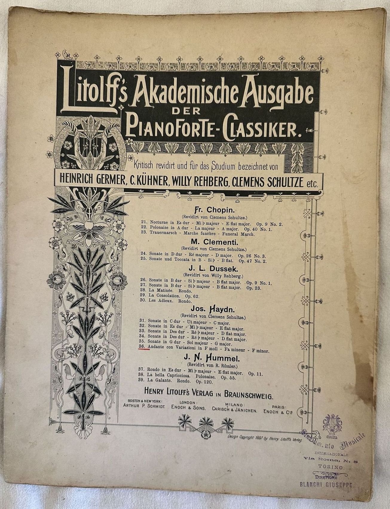Edizione del 1897 della melodia "Andante con variazioni in fa minore" del compositore austriaco Joseph Haydn (1732-1809). In ottime condizioni. Copertina editoriale in ottime condizioni con lievi usure marginali. Legatura in buone condizioni. Pagine in ottime condizioni con rare fioriture. In Folio. cm. 35x27. Pp. 11.Edition of 1897 of the melody "Andante con variazioni in fa minore" by the austrian composer from Austria Joseph Haydn (1732-1809). In very good conditions. Editorial cover in very good conditions lightly worn in the extremities. Binding in good conditions. Pages in very good conditions with occasional foxing. In Folio. cm. 35x27. Pp. 11.
