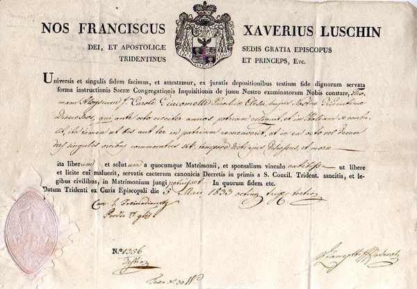 un foglio 21x30 cm, su carta vergata. Condizioni : USATO - Stato : Buono, ordinari segni d'uso e del tempo. Altre note : Sul fronte del documento è presente il sigillo a secco della diocesi di Trento; sul retro l'accettazione da parte della Cancelleria Arcivescovile di Ravenna, datata 27/12/1833.