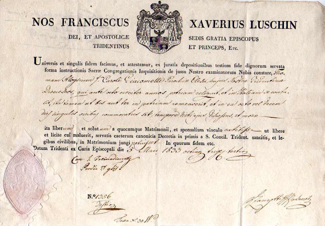 Littera Testimonialis rilasciata dalla cancelleria di Francesco Saverio Luschin, vescovo di Trento, che certifica che Tommaso Aloisio del fu Carlo Giacometti da Clesi, emigrato in Italia 8 anni prima, è libero da impedimenti e vincoli matrimoniali.