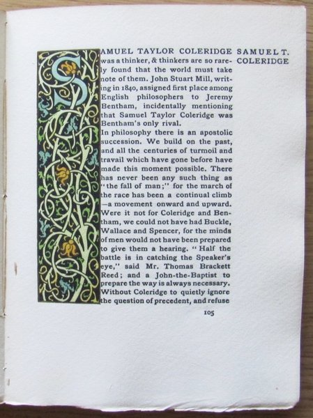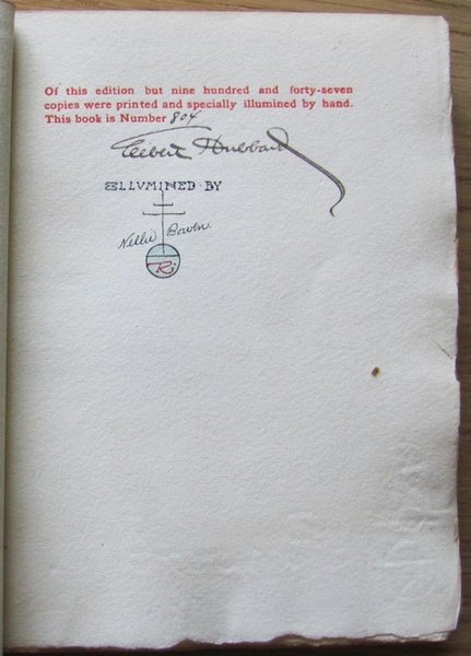 Il bellissimo frontespizio e i capilettera sono illustrati da Samuel Warner, i 6 ritratti f.t. degli autori, tutti protetti da velina, sono di Nellie Bowlen. Publ. by Roycrofter - New York, 1900. Edizione in tiratura Limitata a 947 esemplari numerati, nostro n° 804. Pelle scamosciata editoriale con dorso non originale in cartoncino muto. Le copertine in pelle si presentano sbiadite e usurate ai margini ma l'interno è Perfetto. Bell'Ex-Libris in antiporta. 15x19,5; pp.162. Buonissimo stato. , Molto buono (Very Good)
