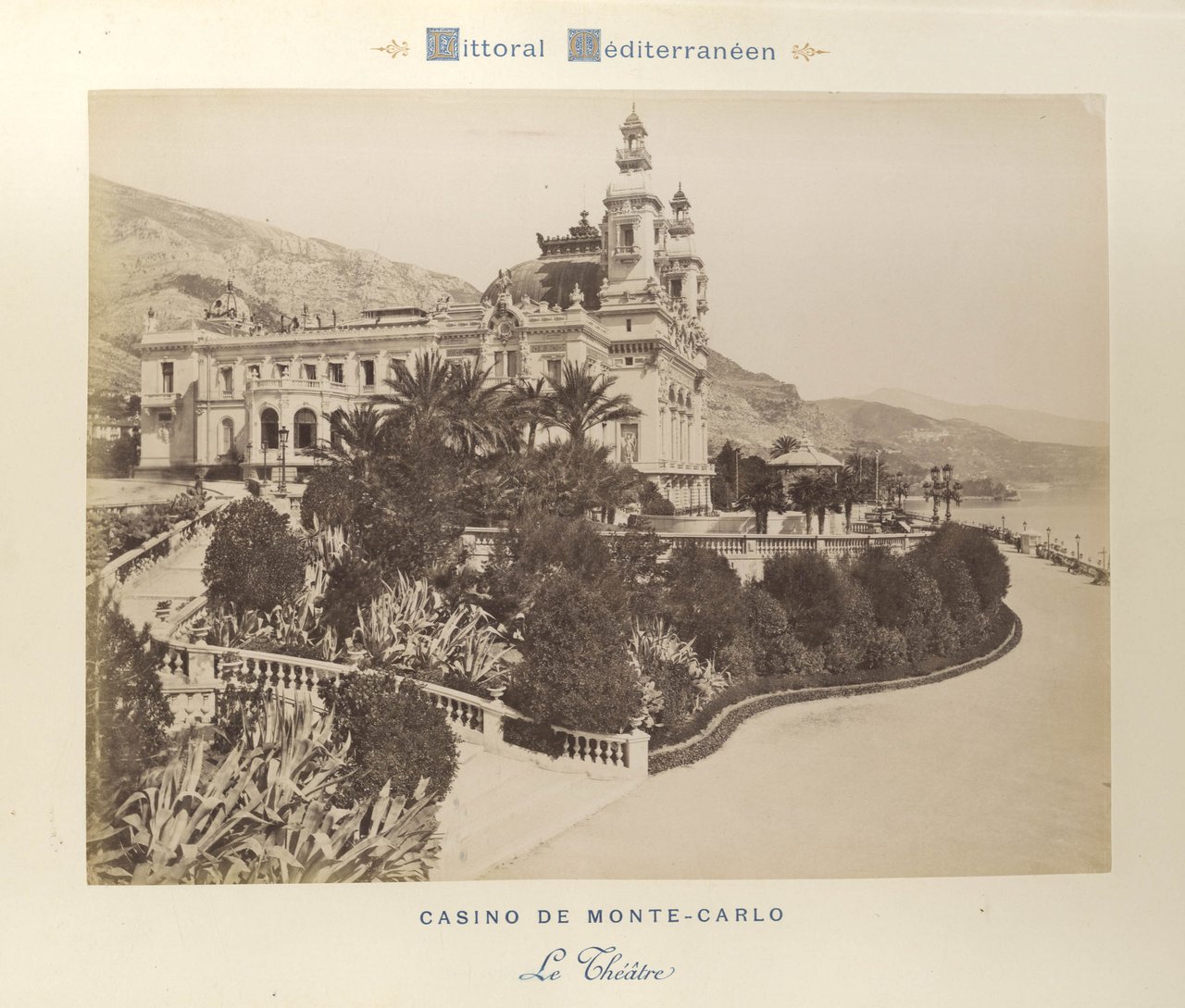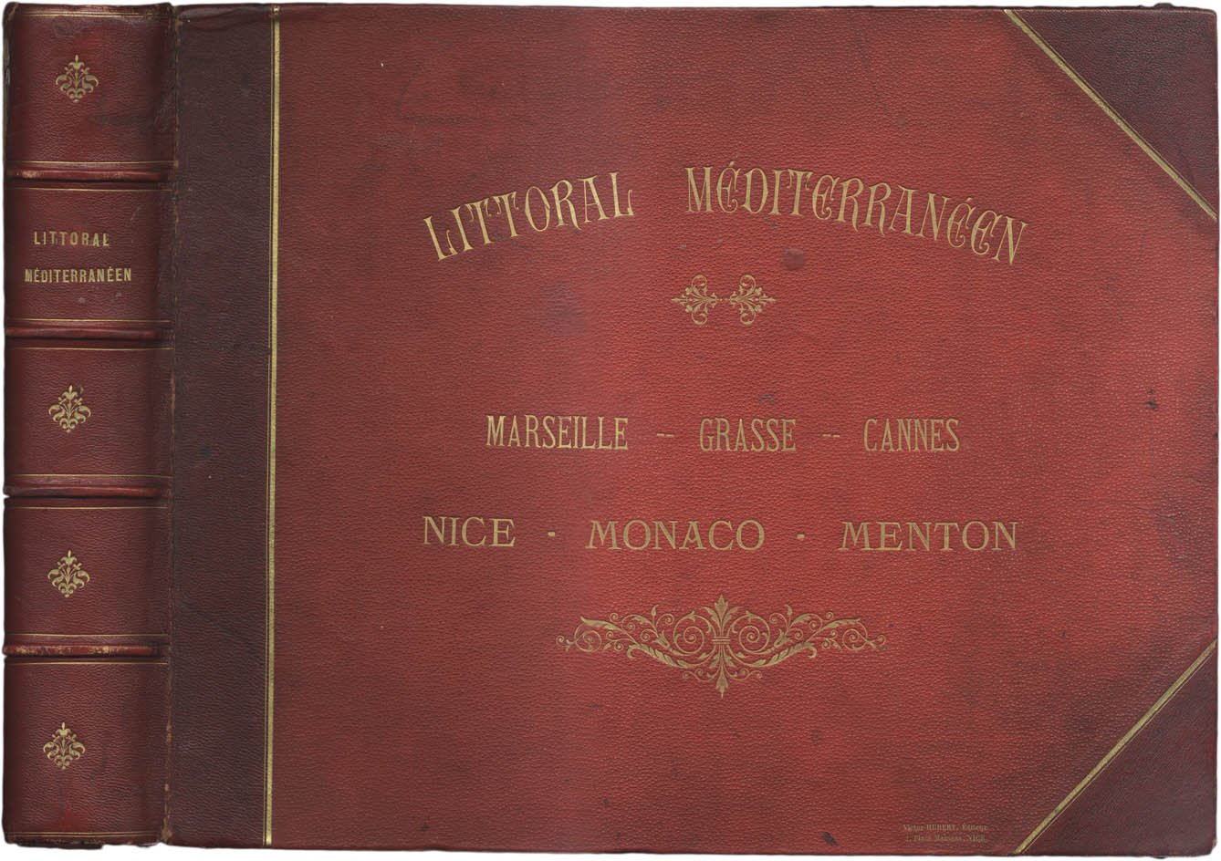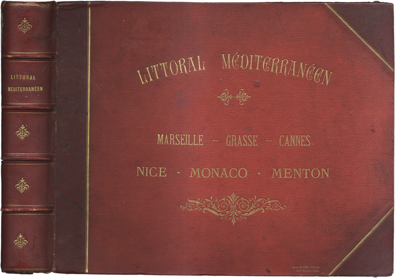 >in-folio oblungo (cm 31,4 x 39,5 ), ff. 25 cartonati con applicate al recto e verso 50 stampe fotografiche all'albumina (cm 21,5 x 27,2); nella parte superiore ed in quella inferiore di ciascun foglio il titolo della veduta stampato in litografia in blu con motivi decorativi in oro. Bella legatura in mezzo marocchino rosso, titolo oro e fregi al dorso a nervi ed al piatto superiore, tagli dorati. Le belle fotografie, di anonimo paesaggista, ritraggono le principali località della Costa Azzurra, in particolare: Marsiglia, Hyères les Palmiers, Saint Raphael, Grasse, Cannes, Nice, Villefranche, Beaulieu, Monaco, Montecarlo e Menton. In buono stato di conservazione, lievi difetti al dorso.