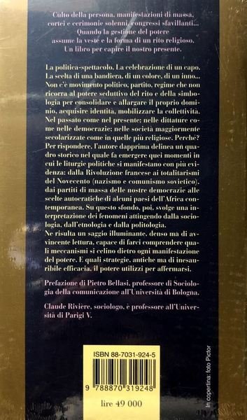 Soggetti: Politica, Riti, Analisi sociologica, Feste pubbliche, Sociologia, Scienze sociali, Potere, Leadership. Movimenti politici, Consenso, Partiti, Cerimonie, Apparati, Simbologia, Culto, Masse, Liturgia, Rituali, Simboli, Totem, Repressione, Dissenso, Propaganda, Cultura, Influenza, Cerimoniali, Poder, Ciencias sociales, Rivoluzione francese, Assolutismo, Monarchia, Re, Tiranni, Regimi, Controllo, Monarchie, Révolution françaises, Identità, Symbolique politique, Science politique, Liturgie, Cérémonie, Fête, Rite, Athènes, Jean-Jacques Wunenburger, Impero romano, Grecia, Comunione, Ideali, Coesione, Collettività, Sacralizzazione, Riti religiosi, Religione, Atti solenni, Slogan, Régimes autoritaires, Democrazia, Sociologie, Le pouvoir, Spettacolo, Spectacle, Etnologia, Mobilitazione, Libertà, Politiche nazionali, Nazionalismo, Cesarismo, Capi-popolo, Terzo Mondo, Comunismo, Totalitarismo, Terzo Reich, Hitler, Mussolini, Fascismo, Architettura, Nazionalsocialismo, Personalità, Stalin, Ideologie, Militarismo, Memoriali, Religione civile, Lenin, Africa, Chiesa, Ordine, Patriottismo, Teatralizzazione, Unione Sovietica, Storia, Comunicazione, Mass Media, Sovrastruttura, Classi dirigenti, Intellettuali, Istituzioni pubbliche, Libri Vintage, Fuori catalogo, Saggi, Iconografia, Immaginario, Mito, Politics, Rites, Sociological Analysis, Public Holidays, Sociology, Social Sciences, Power, Leadership, Political Movements, Consent, Parties, Ceremonies, Apparatus, Symbology, Worship, Masses, Liturgy, Rituals, Symbols, Repression, Dissent, Propaganda, Culture, Influence, Ceremonial, French Revolution, Absolutism, Monarchy, King, Tyrants, Regimes, Control, Monarchies, Identity, Liturgies, Roman Empire, Greece, Communion, Ideals, Cohesion, Collectivity, Sacralization, Religious Rites, Religion, Solemn Acts, Democracy, Sociology, Show, Spectacle, Ethnology, Mobilization, Freedom, National Policies, Nationalism, Caesarism, People's leaders, Third World, Communism, Totalitarianism, Third Reich, Fascism, Architecture, National Socialism, Personality, Ideologies, Militarism, Memorials, Civil religion, Church, Order, Patriotism, Theatricalization, Soviet Union, History, Communication, Superstructure, Leading classes, Intellectuals, Public institutions, Books out of print, Essays, Iconography, Imaginary, Myth