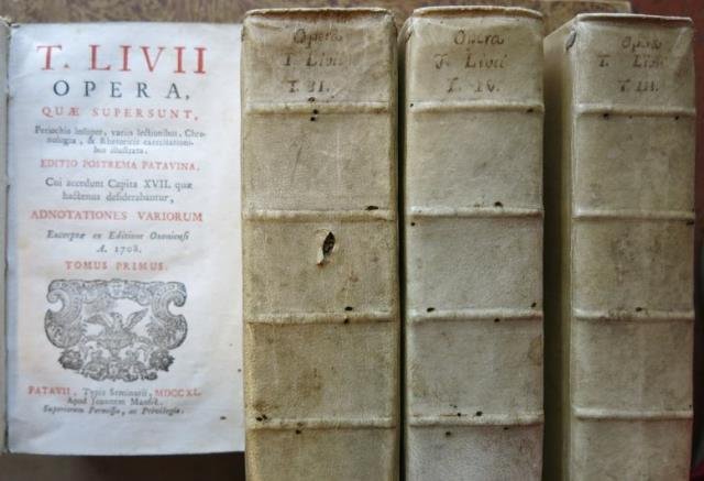 Editio postrema Patavina. Patavii, Typis Seminarii, Apud Joannem Manfrè, 1740. Quattro tomi in 12esimo antico (cm 9 x 16,5), antip. incisa, front. in rosso / nero al primo tomo e in nero ai successivi, piccola marca tip. su ciascun volume, pp. 800; 783; 699; 699 + oltre un centinaio di "Index Rerum", solide e orig. legature in piena perg. rigida con unghiette, nervetti ai dorsi, contropiatti in carta decorata, tagli in blu. Tito Livio (Padova, 59 a C. - Padova, 17 d. C.), storico romano, autore della monumentale "Ab Urbe Condita libri", una storia di Roma dalla sua fondazione fino alla morte di Druso, figliastro di Augusto (verso il 9 a. C.). Opera completa in quattro tomi e in cinque decadi più l' Epitome che segue alla quinta decade. Al tomo I una piccola mancanza marginale della pergamena; al tomo II si è in parte scollata la leg. internamente al dorso (ma restano anche tutti i laccetti di cucitura). Nell'insieme conservazione ottima di tutti i volumi.