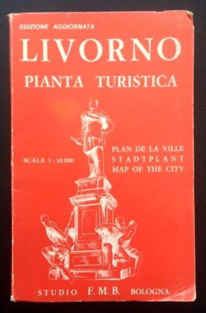 Studio F.M.B. Bologna, Monte Paschi di Siena, s. d. ma 1950 circa. Grande cartina ripiegata della città di Livorno, presente lo stradario, scala 1:10.000, legenda a 42 voci, cm 59 x 79,50, bross. in carta rossa con due pubblicità aziendali con scritte in azzurro al contropiatto di copertina.