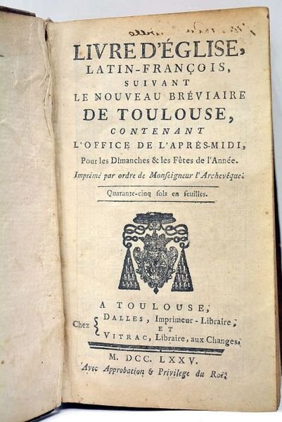 LIVRE D'EGLISE, latin-françois suivant le Nouveau Bréviaire de Toulouse, contenant l'Office de l'après-midi, pour les Dimanches et les Fêtes de l'Année. Imprimé par ordre de Monseigneur l'Archevêque. Quarante-cinq sols en feuilles.