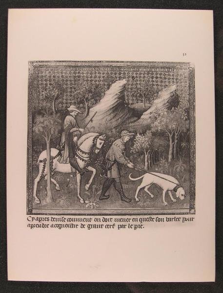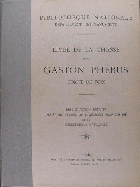 Bibliothèque Nationale Département des Manuscrits, Imprimerie Berthaud Frères, 1910, in/8 carré, texte préliminaire de C. Couderc, 35 pages, ensuite 90 (planches) miniatures du manuscrit Français 616 de la Bibliothèque Nationale en noir et blanc en photocollographie, sous chemise avec étui de l'éditeur. J.Thiébaud col.735. Le Livre de chasse fut rédigé, ou plus exactement dicté à un copiste, de 1387 à 1389 par Gaston Phébus, comte de Foix. Cet homme à la personnalité complexe et à la vie mouvementée, que l'historien Jean Froissart évoque dans ses célèbres Chroniques était, comme tous les seigneurs du Moyen Âge, un grand chasseur .