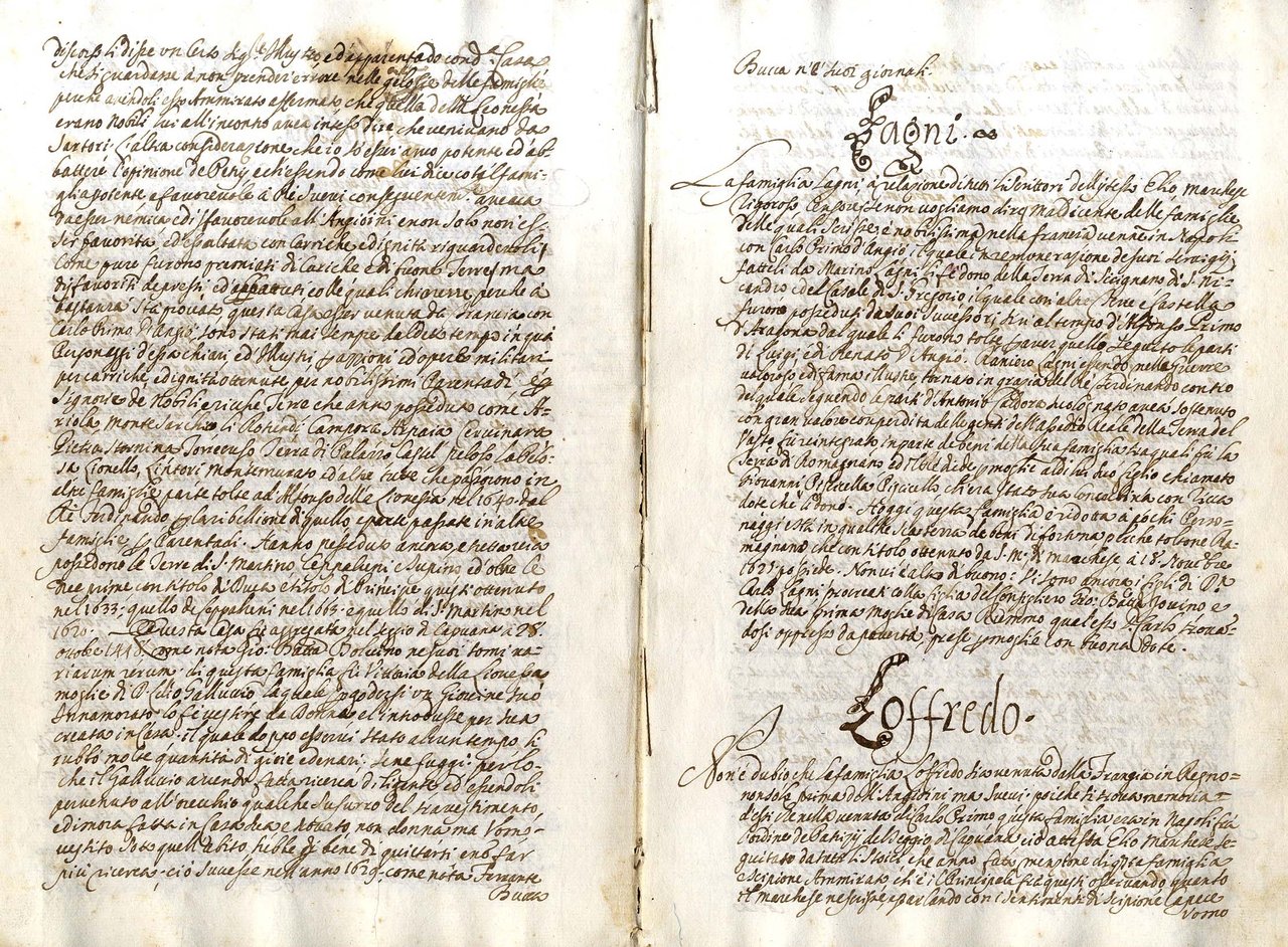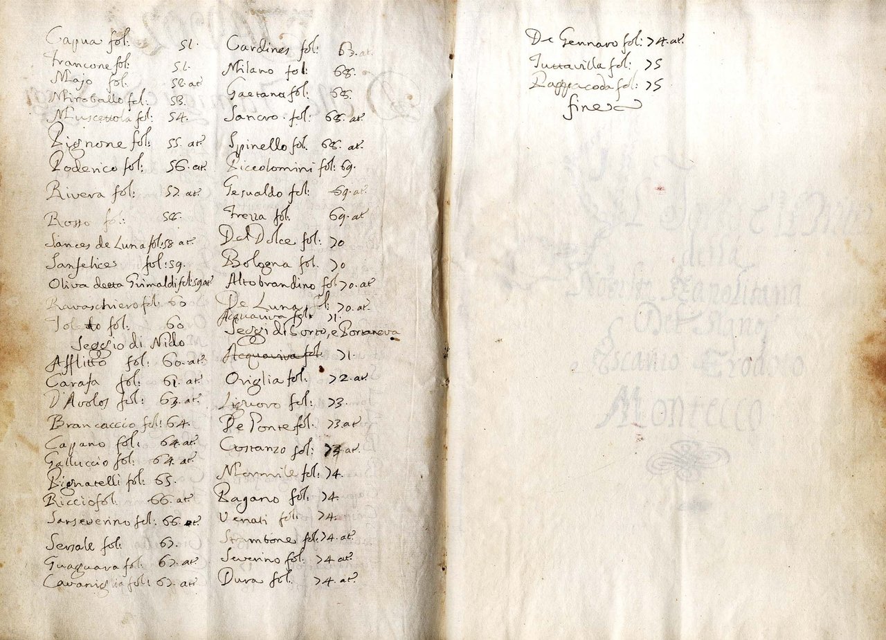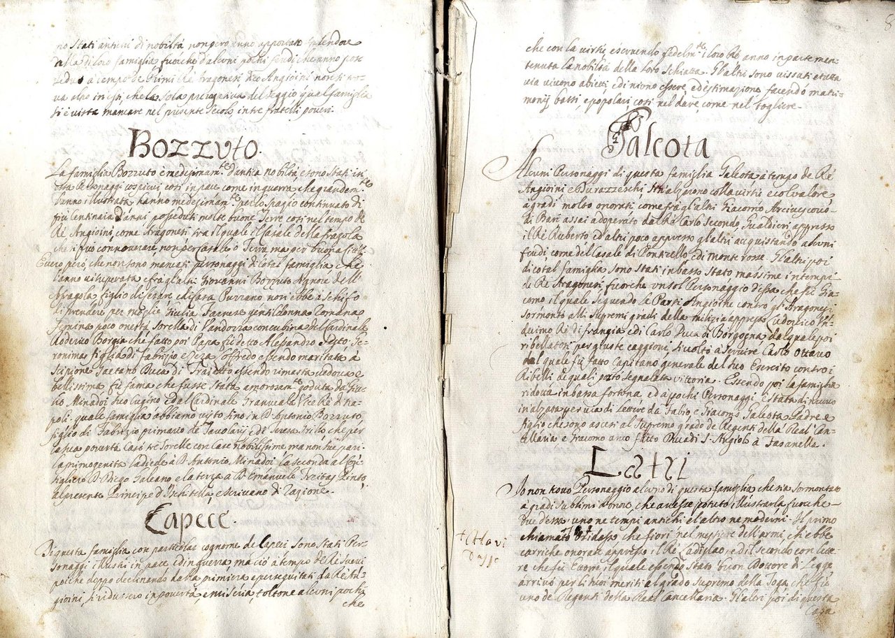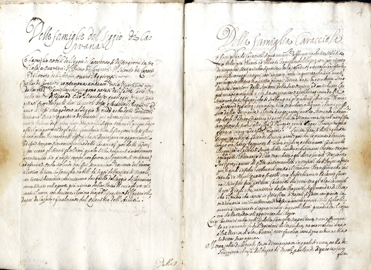 >in-4 (mm-295x205), ff. 75, (3); leg. p.perg. molle (mancanza al dorso, restaurata). Fogli vergati al recto ed al verso in chiarissima grafia, con aggiunte e modifiche ad opera di altre mani, presenti fino all'anno 1779 (pp. 73 verso). Minuziosa raccolta di notizie su 92 famiglie nobili divise nei cinque seggi napoletani di Capuana, Barile, Montagna, Nido, Porto e Porta Nova, con particolare attenzione alle virtù ma anche ai vizi delle stesse come del resto enunciato nel titolo. (Fera, vol. III, p. 267, registra un manoscritto analogo apparentemente senza aggiunte, ma con autore Montecco Fortunato Erodoto e con l'indicazione della data 1695 nel titolo).