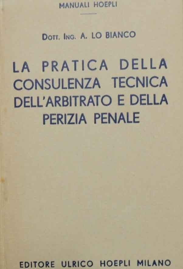 Antonio Lo Bianco, La pratica della consulenza tecnica dell’arbitrato e della perizia penale secondo i nuovi codici della procedura. La Perizia sull’Espropriazione per Pubblico Interesse. Norme indispensabili agli Ingegneri, Architetti, Agrimensori, Geometri, Dottori in Agraria, in Scienze Economiche-Commerciali, Ragionieri, Meccanici, Minerari e Periti in genere. Con sentenze verbali, moduli, perizie, ecc., Editore Ulrico Hoepli, Milano 1943, quinta ed. della Perizia ed arbitrato, pp. XII, 419, cm 16, cart. ed. con titoli al dorso e al piatto. Collana manuali Hoepli. Leggere tracce d’uso e sgualciture, minime fioriture, lievissima brunitura della carta, per il resto buona copia.
