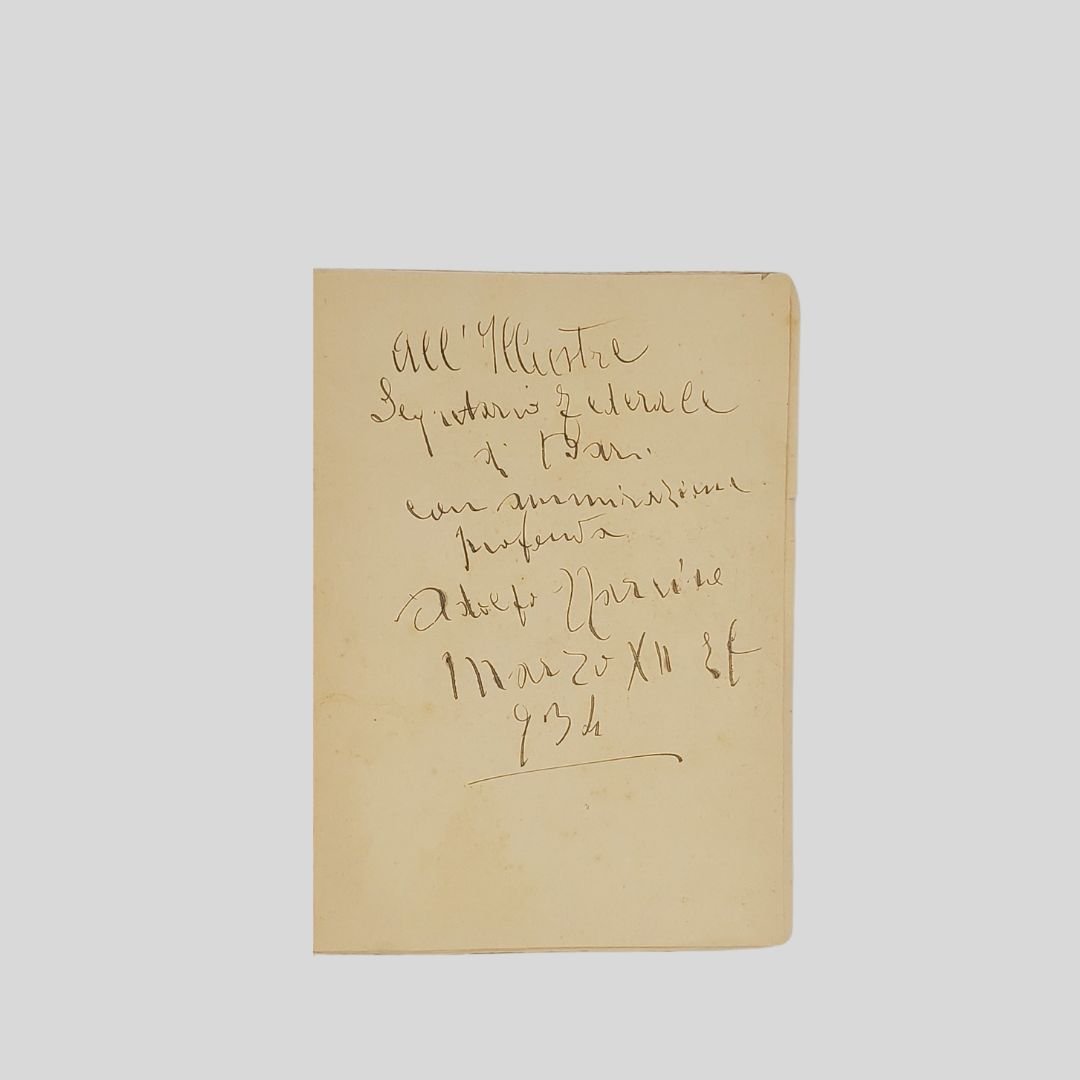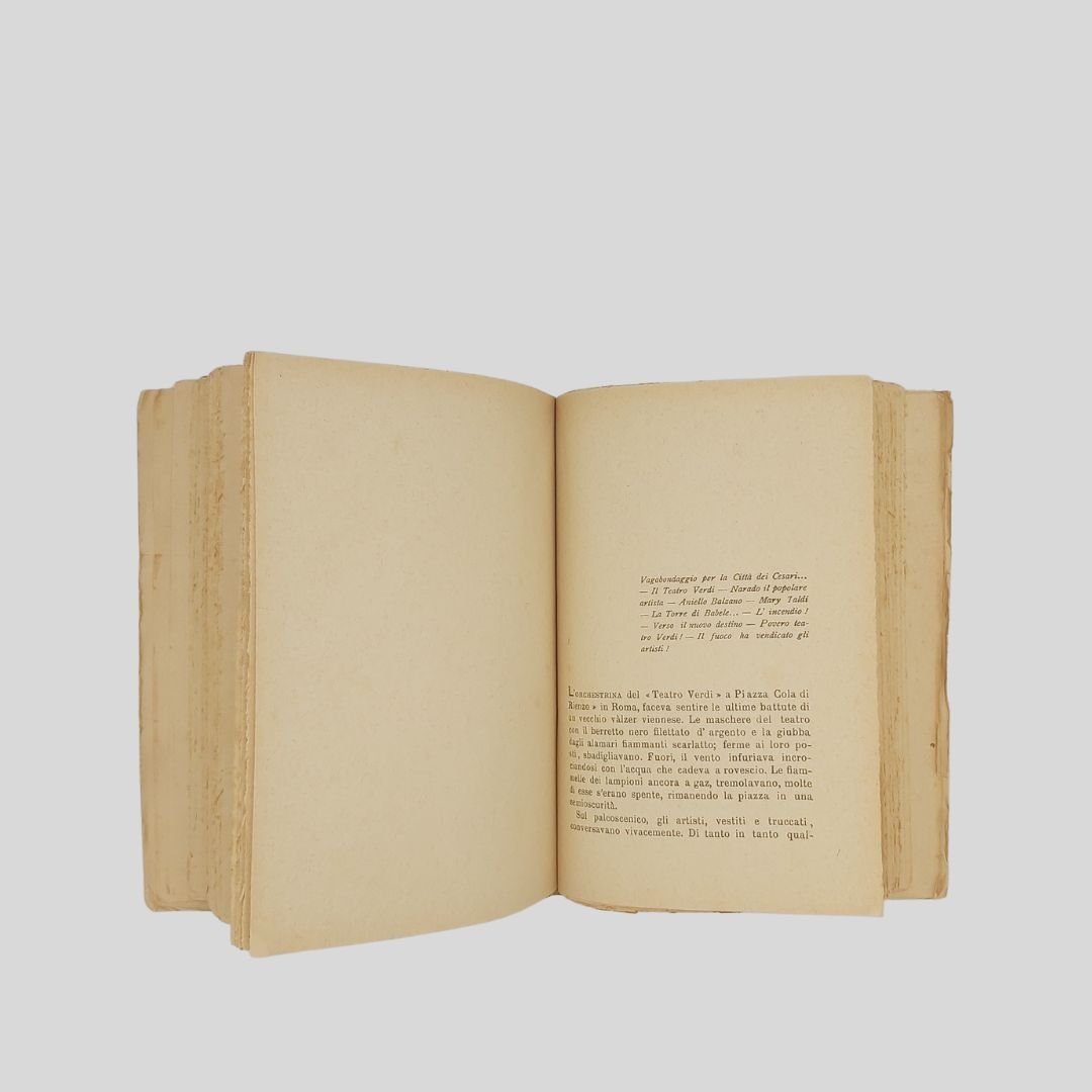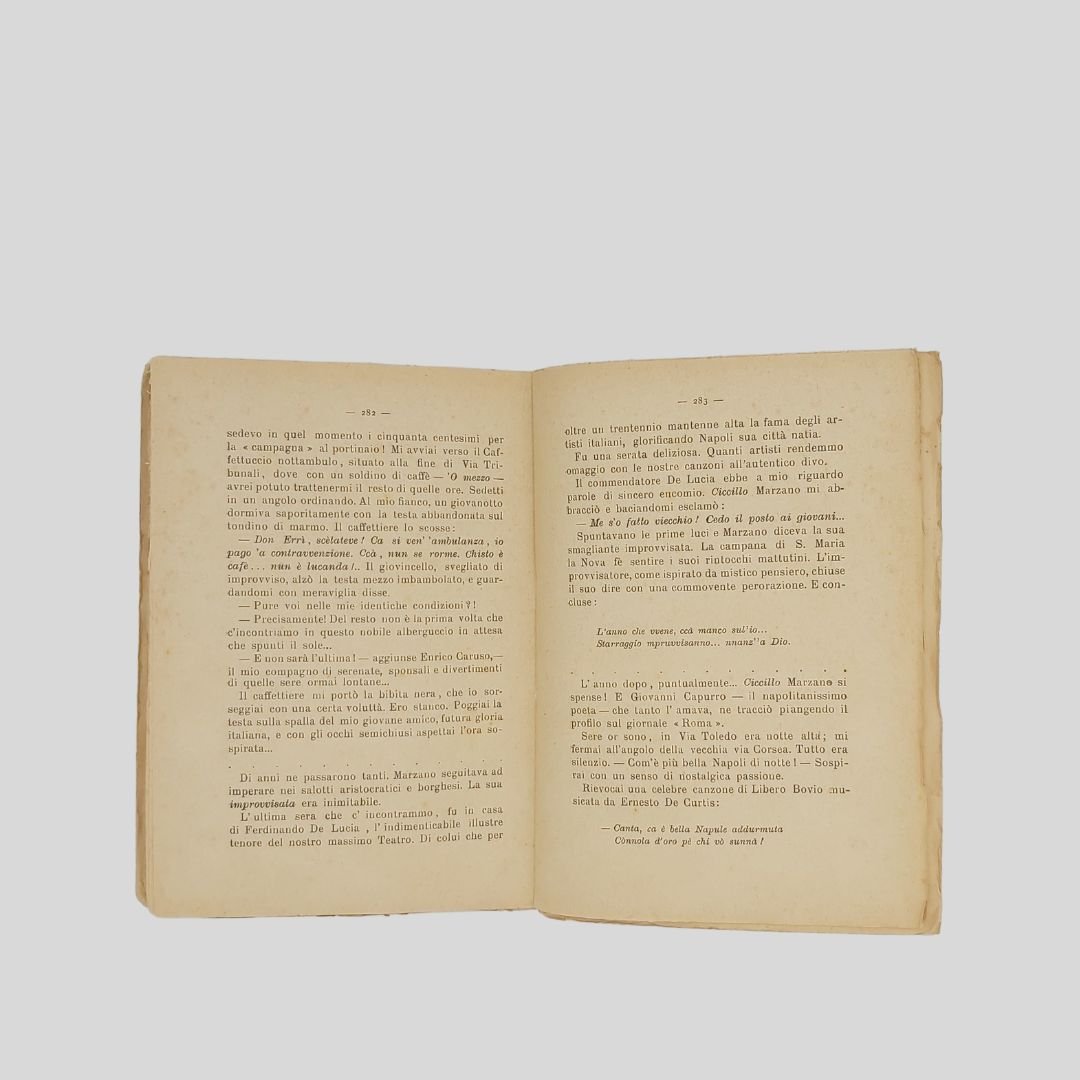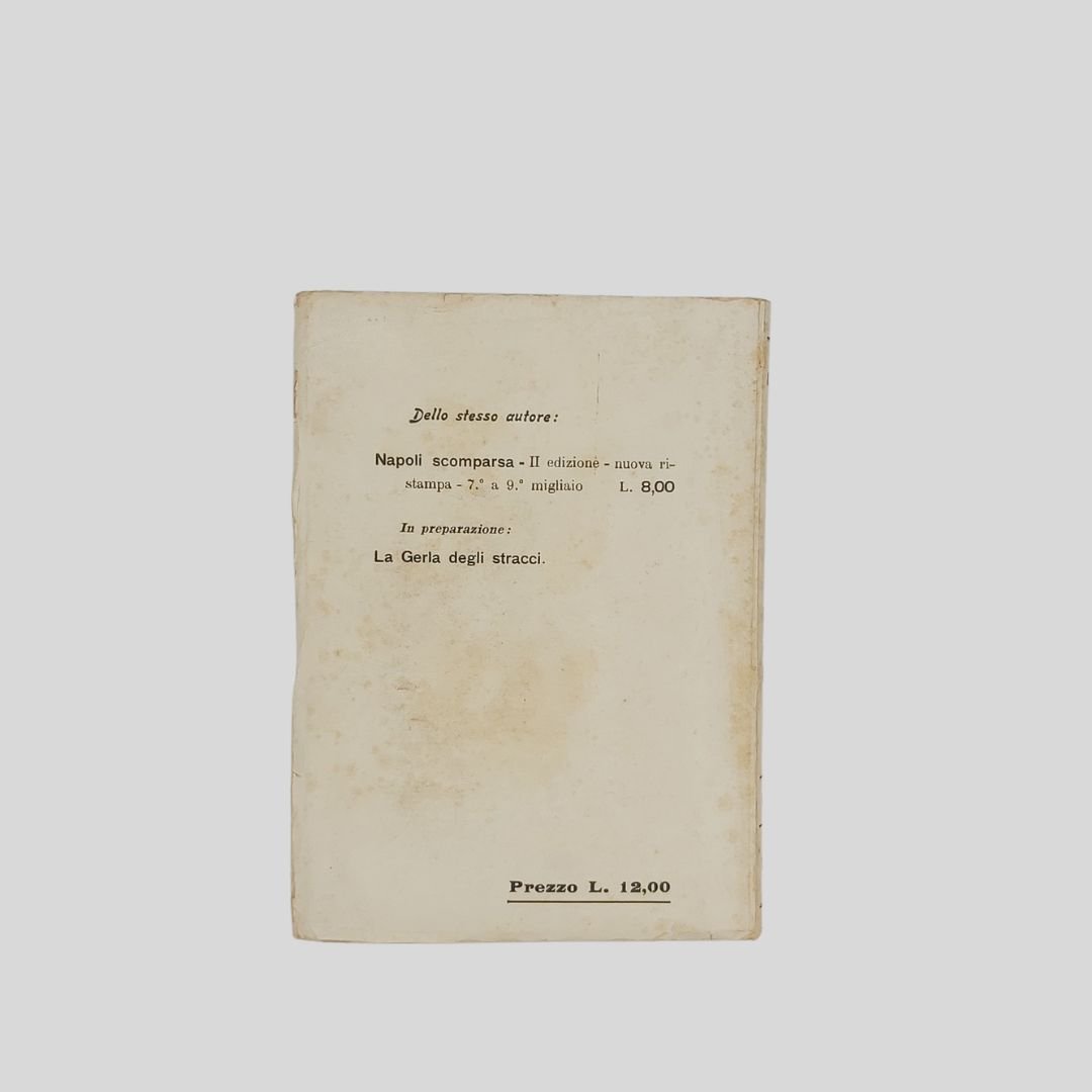 In-8° (cm 19,5), pp. 294. Dedica dell’autore al”Segretario Federale di Bari “, marzo 1934. In buone condizioni. Raro e ricercato. Un importante spaccato della Napoli a cavallo tra la fine dell’800 e i primi del ‘900. La canzone di Ferdinando Russo, Enrico Caruso, La Birreria Monaco, I Posteggiatori, I Caffè-Concerto, Il Caffè Scotto Jonno, Salvatore De Muto, Nel Regno di Pulcinella, Don Davide Petito, Don Gennaro Pantalena, La morte di Enrico Petito, Girolamo Gaudiosi emulo di Don Eduardo Scarpetta, Guappi e Sciammerie, Il Concerto “Ganbrinus”, Il Capocomico filosofo [(Don Peppe Antoniani], Il teatro San Ferdinando, Libero Bovio, tiranno dorato! Salvatore Di Giacomo, Ferdinando Russo, Luca Postiglione, Rocco Galdieri, Ernesto Murolo, Eduardo Pignalosa…<BR><BR>«Lettori benevoli, siatemi indulgenti. Feci del mio meglio per trasmettevi con fedeltà le visioni tumultuose che si avvicendano nel mio cervello. Chitarre, mandolini, balconi e finestrelle, innamorati e fiori, teatri, teatrini, casotti e comici…un vero esercito di poveri e arricchiti sfilò innanzi a vostri occhi come un interminabile corteo in una visione cinematografica».