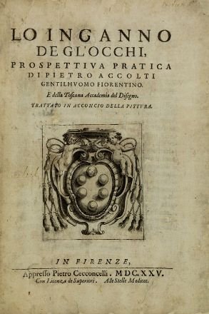 - Prima e unica edizione di questo celebre manuale teorico e, pratico sulla prospettiva, pubblicato postumo e presentato come un trattato di pittura per, gli allievi dell'accademia fiorentina. Accolti, matematico e ingegnere militare della corte medicea, ha condensato in questa opera tutte le sue esperienze sulla, prospettiva arricchendole di elementi che vanno oltre e che, sconfinano in altri campi, come la gnomonica, l'ottica (a cui dedica interessanti pagine nella terza sezione, intitolata De lumi, et ombre) o l'ambito militare, sviluppandone le potenziali applicazioni nel campo, dell’architettura e dell’ingegneria bellica. Inoltre questo, manuale contiene la prima edizione a stampa del trattato di, Leonardo Discorso intorno al disegno. Cfr. Choix 14663, Cicognara 802, Comolli III, 161-62, Fowler 1, Gamba 1749, Graesse I, 11, Piantanida 4320, Poggendorff I, 6, Riccardi I, 4 «Fu tra i primi ad applicare la matematica alla prospettiva»